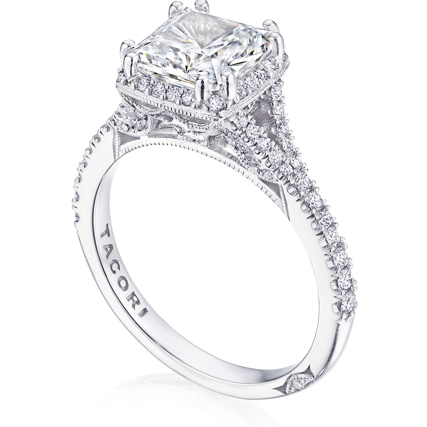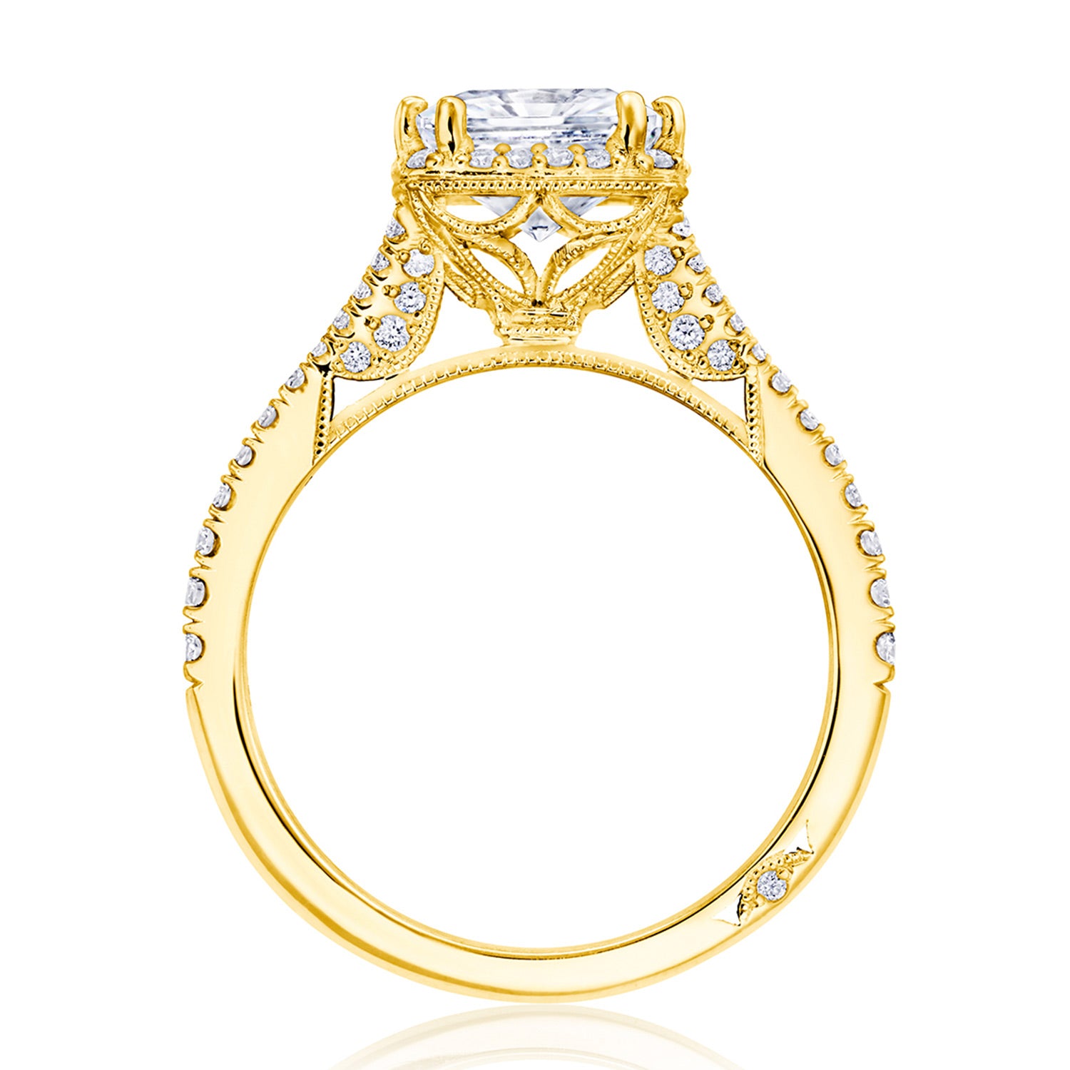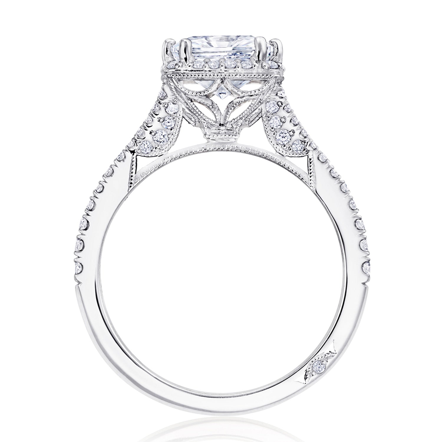 A princess bloom elevates the center stone, which rests on a lace-like, milgrian-studded Cathedral foundation. A pavé ceiling branches and embraces the solitaire, while a signature crescent marks the resting point of the ring.