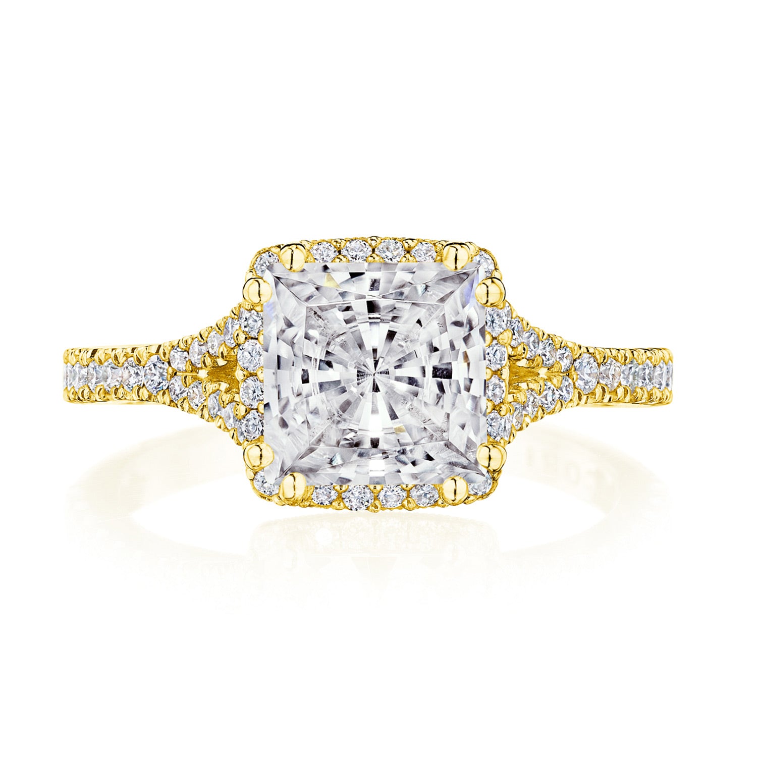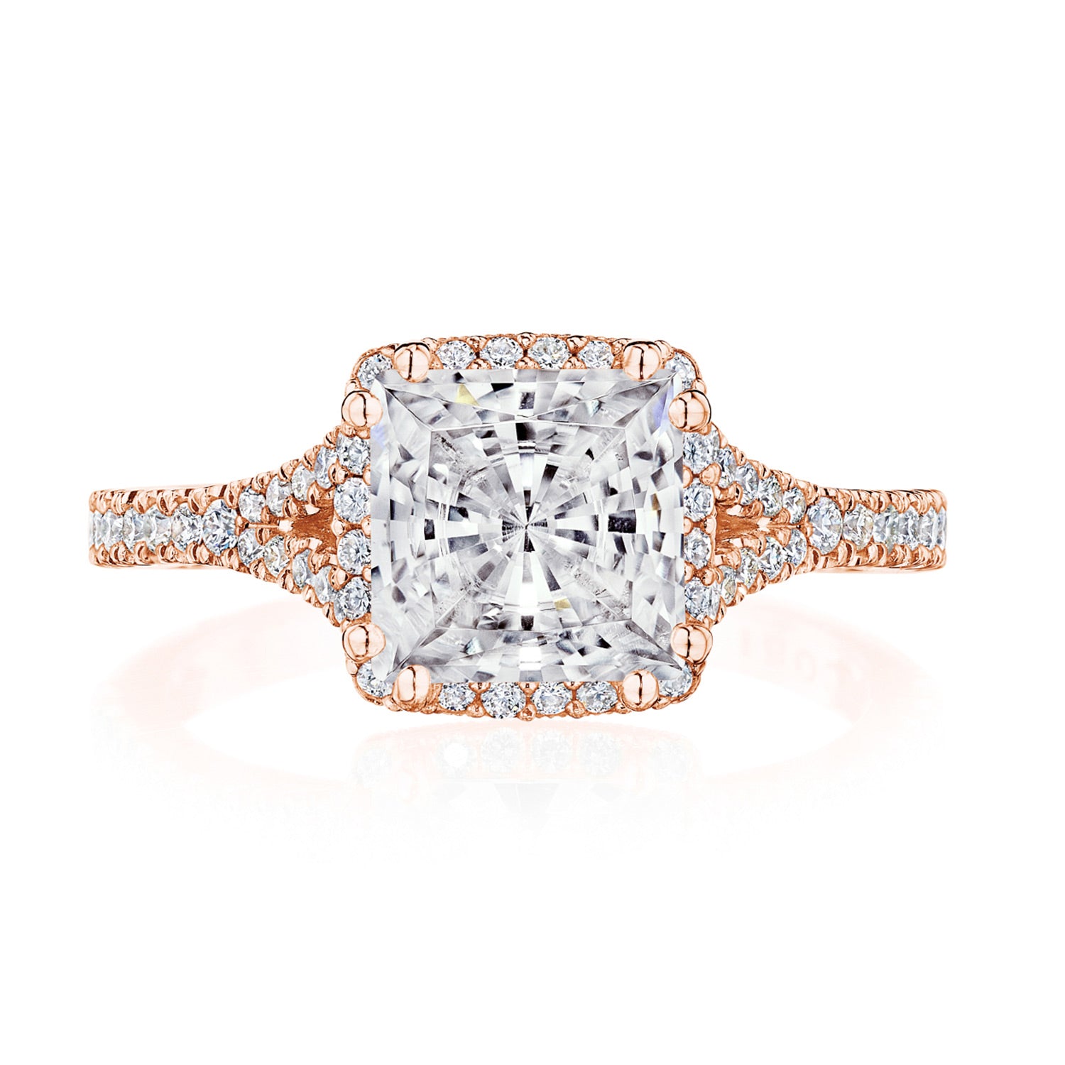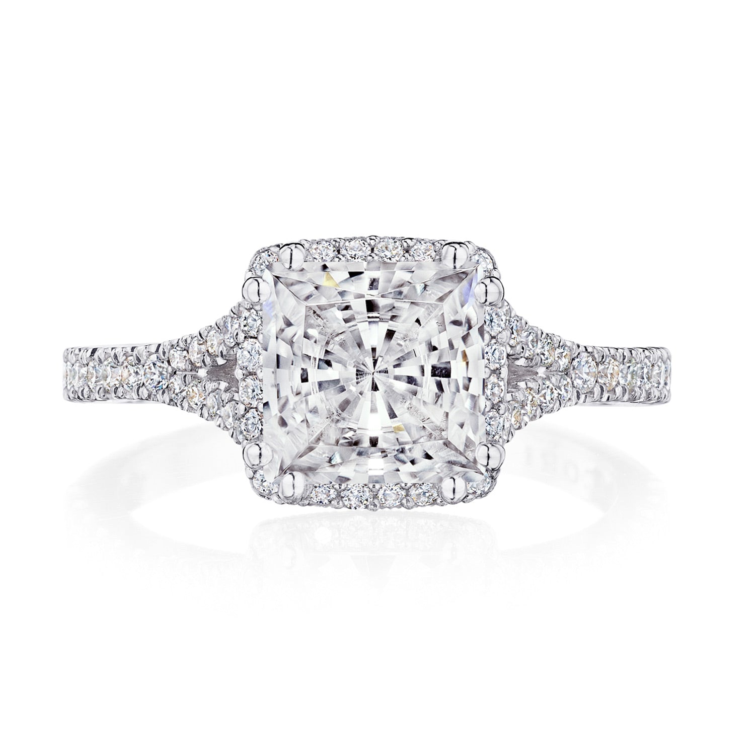 A princess bloom elevates the center stone, which rests on a lace-like, milgrian-studded Cathedral foundation. A pavé ceiling branches and embraces the solitaire, while a signature crescent marks the resting point of the ring.