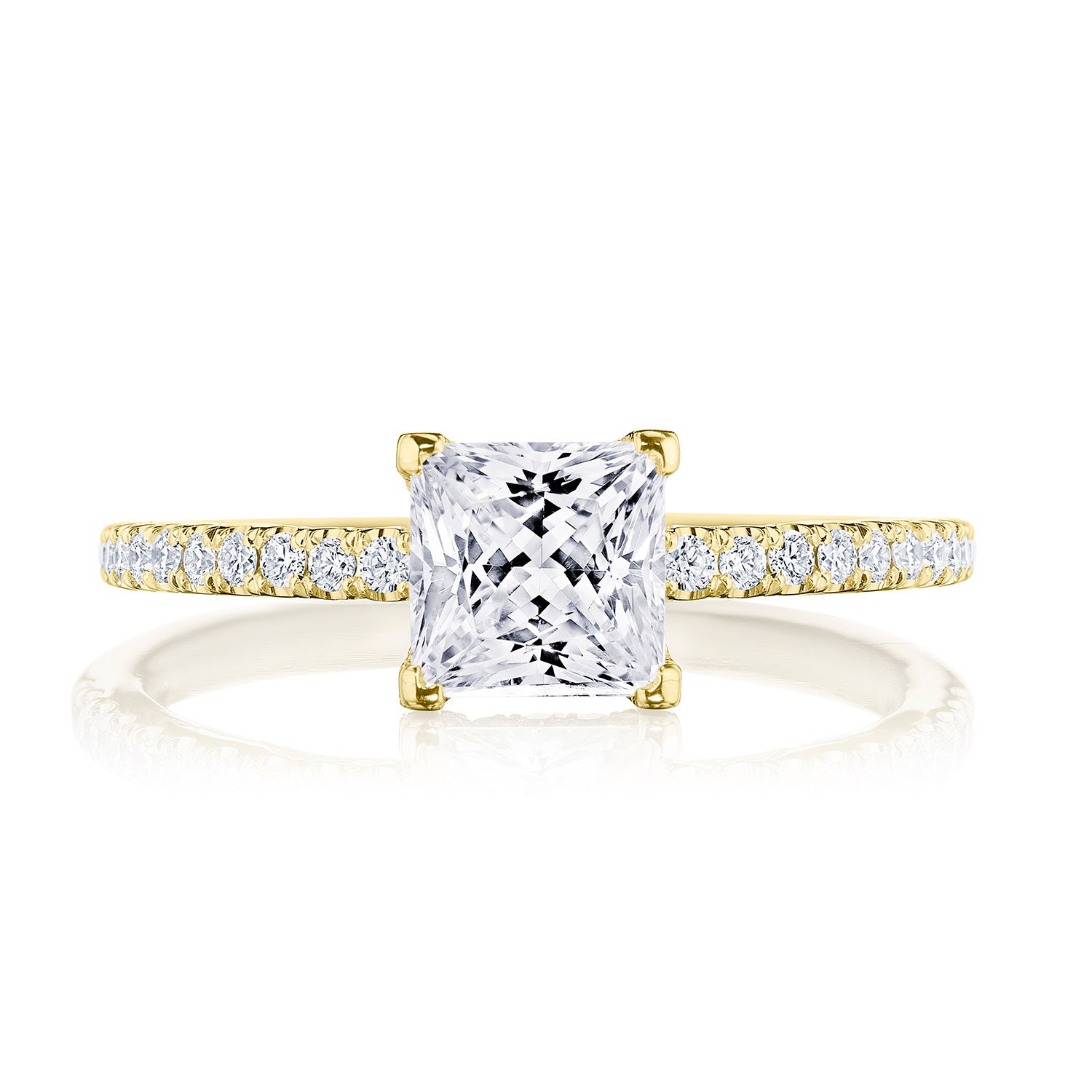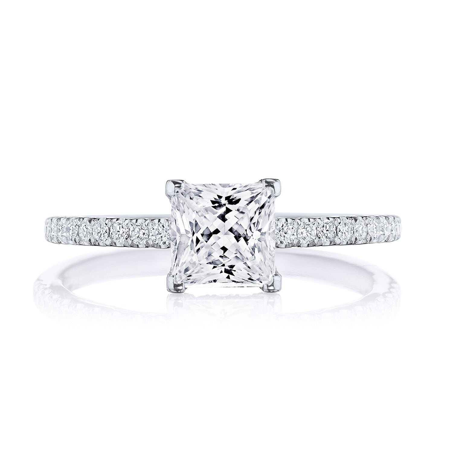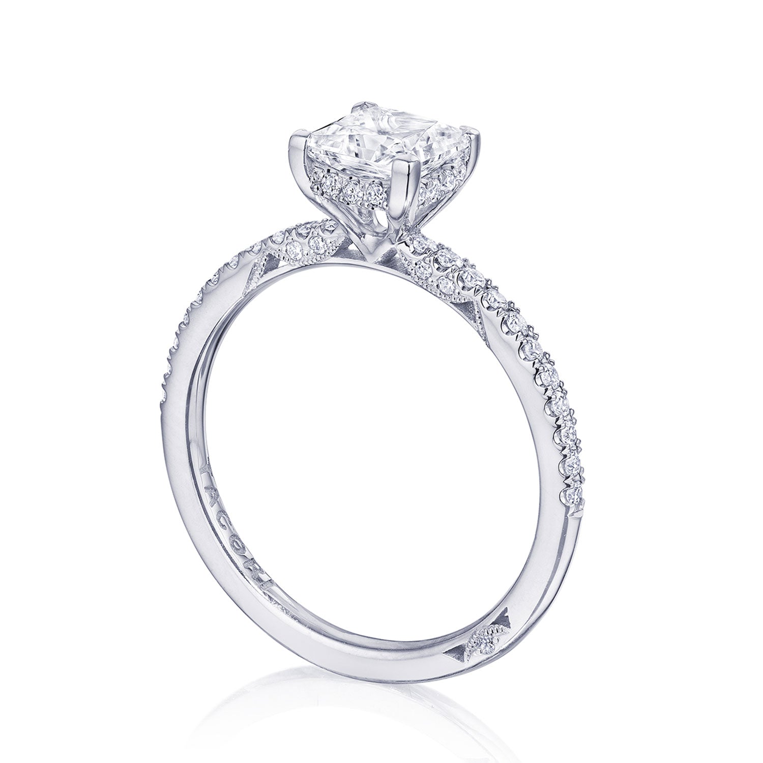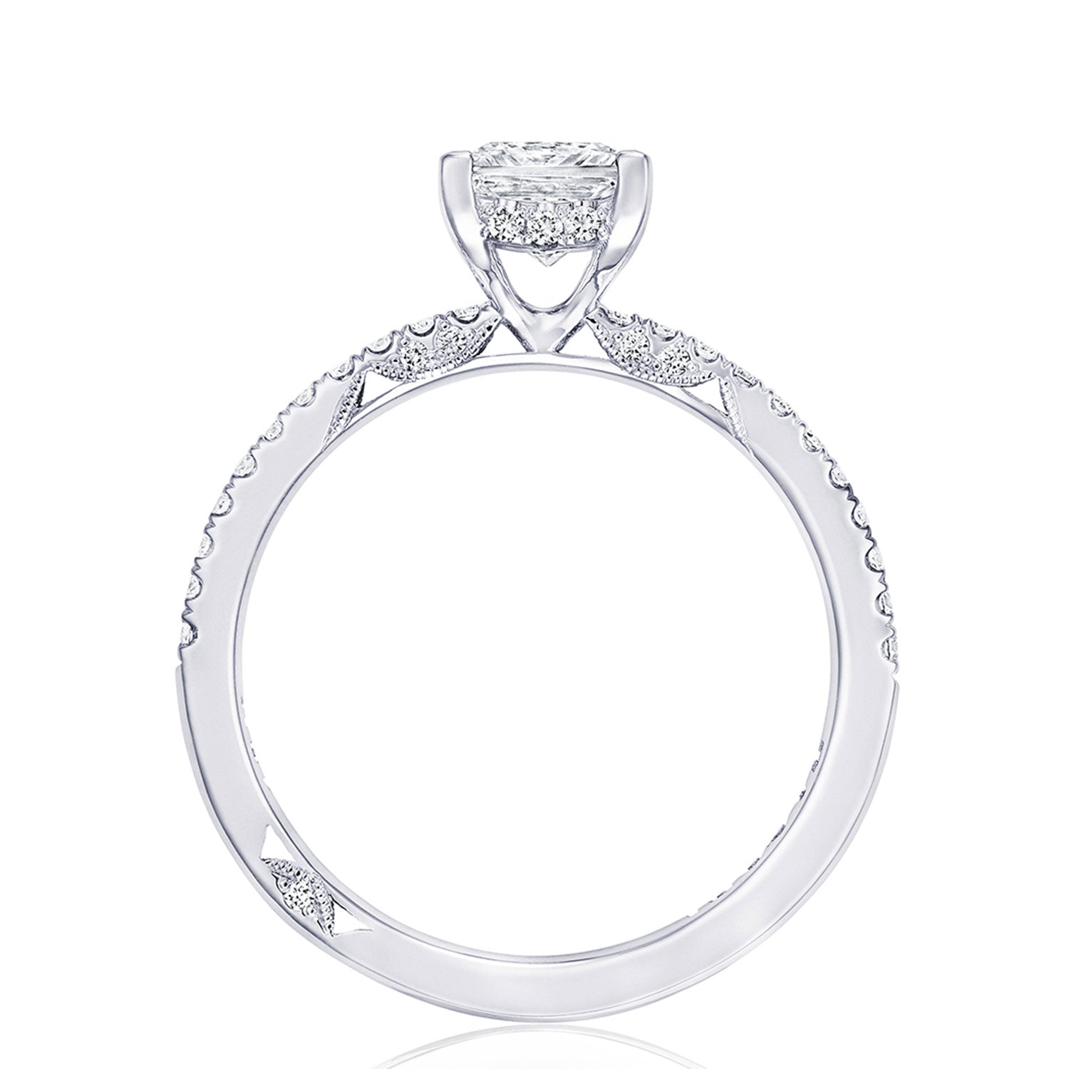 An elegant princess-cut solitaire floats on a Classic 360 foundation with a hidden bloom of diamonds, above a thin, sparkling French- pavé band. The modern Simply TACORI crescent fabric decorates the upper ceiling of the ring.