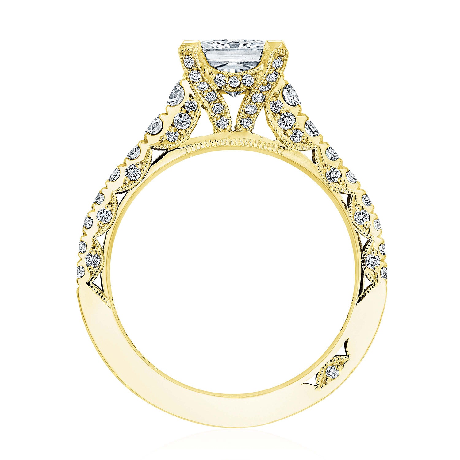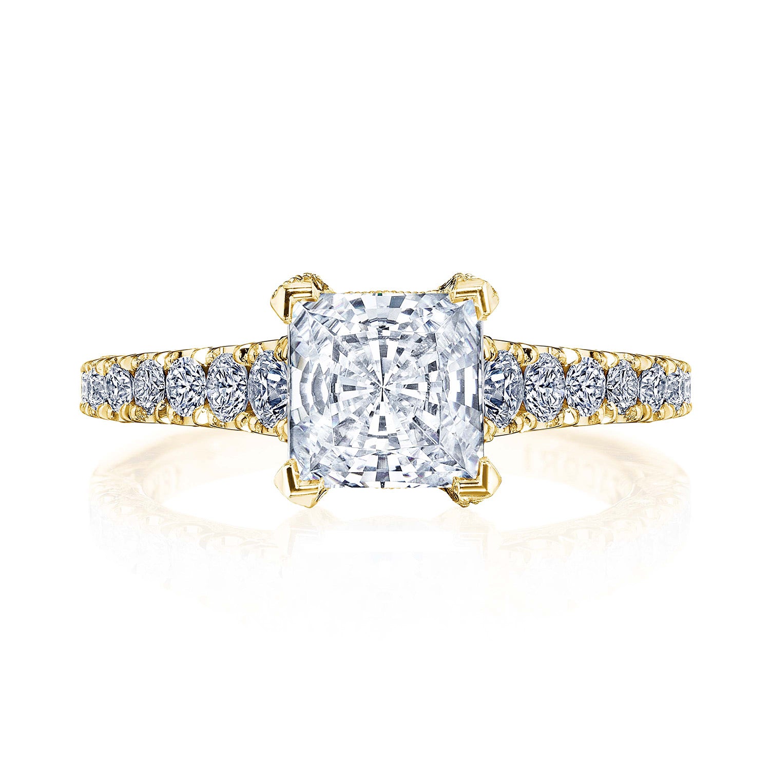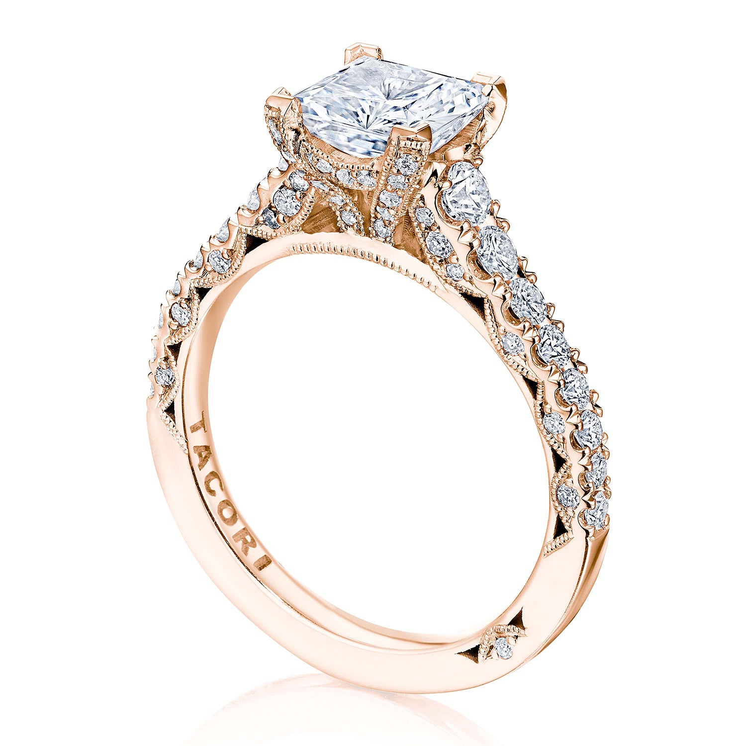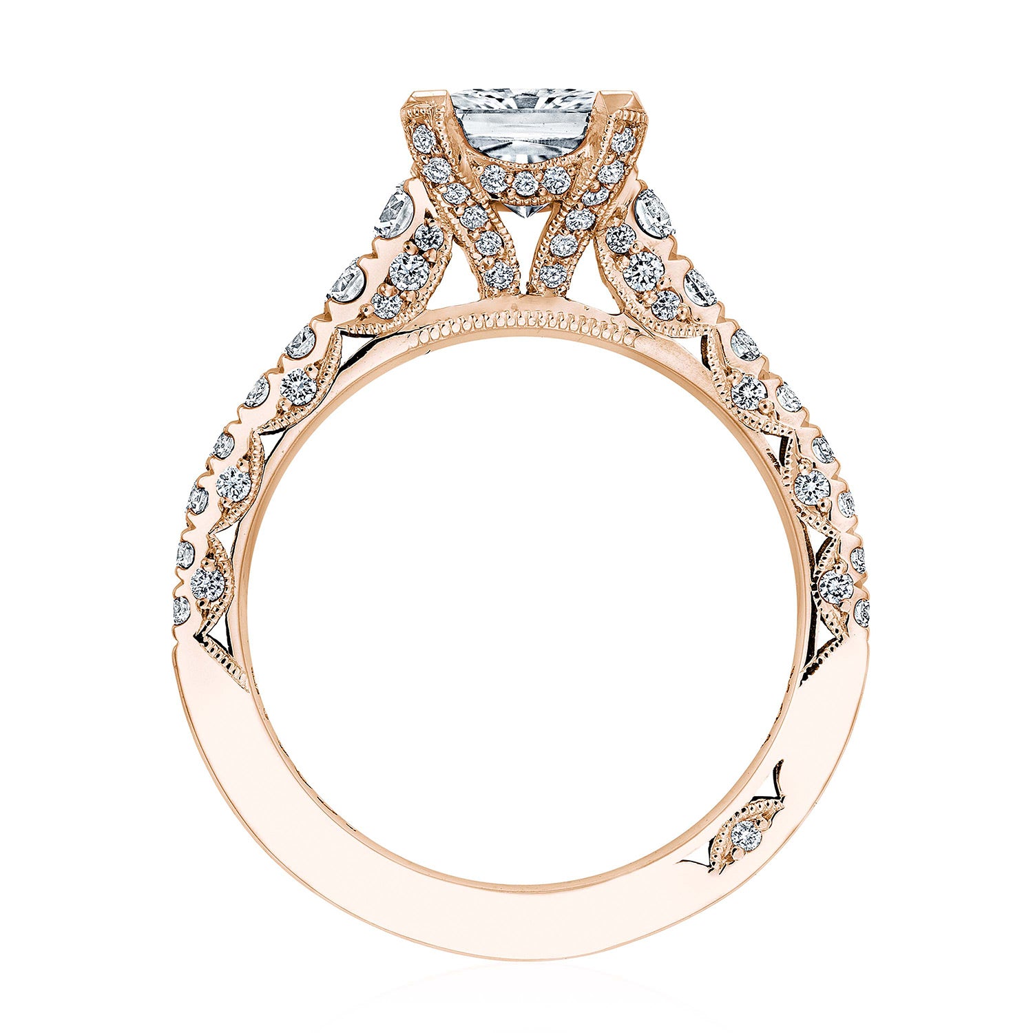 Tapering pavé-set diamonds lead up the ceiling towards the center stone, which is set on a diamond-studded Cathedral foundation above a hidden bloom and a band of Petite Crescent fabric. A Signature Crescent marks the foundation of the ring.