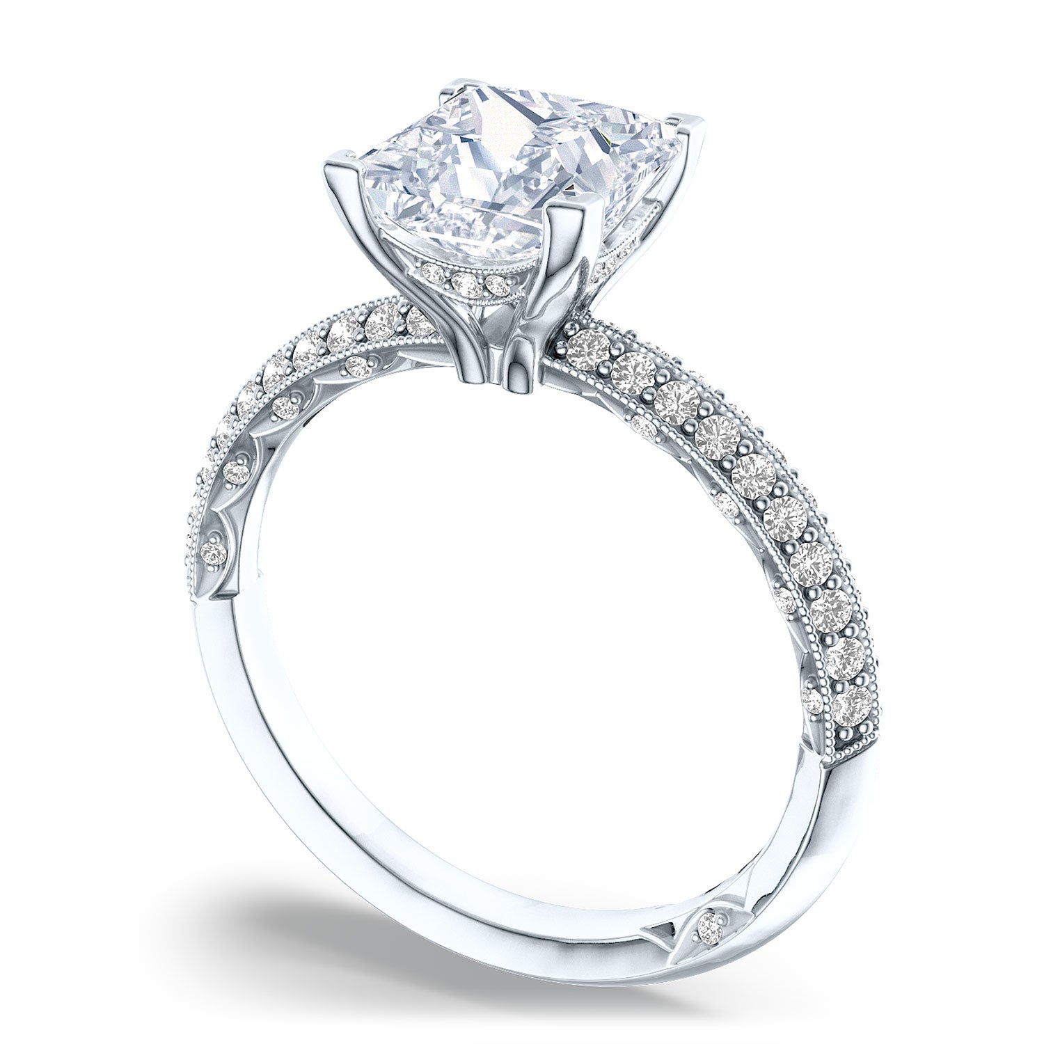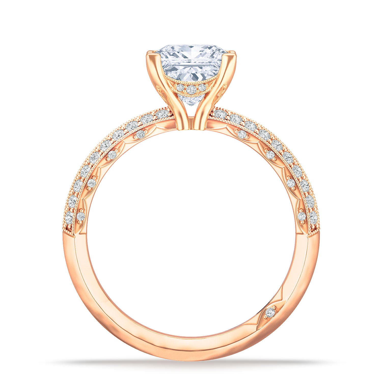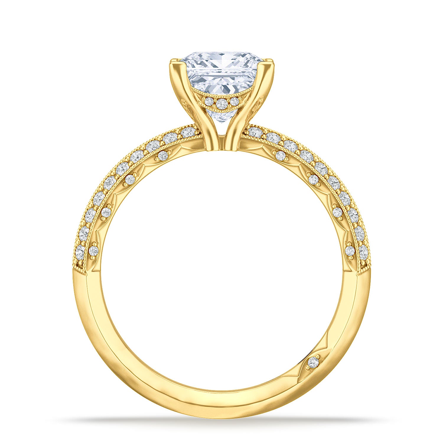 Double pavé lines the ceiling of the angular knife-edge band, while Sculpted Crescent with diamond touches decorate the innerface. The princess solitaire sits on a Classic 360 foundation with a hidden bloom for all-angle sparkle.