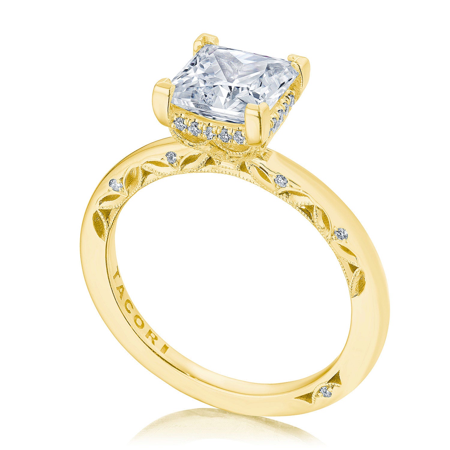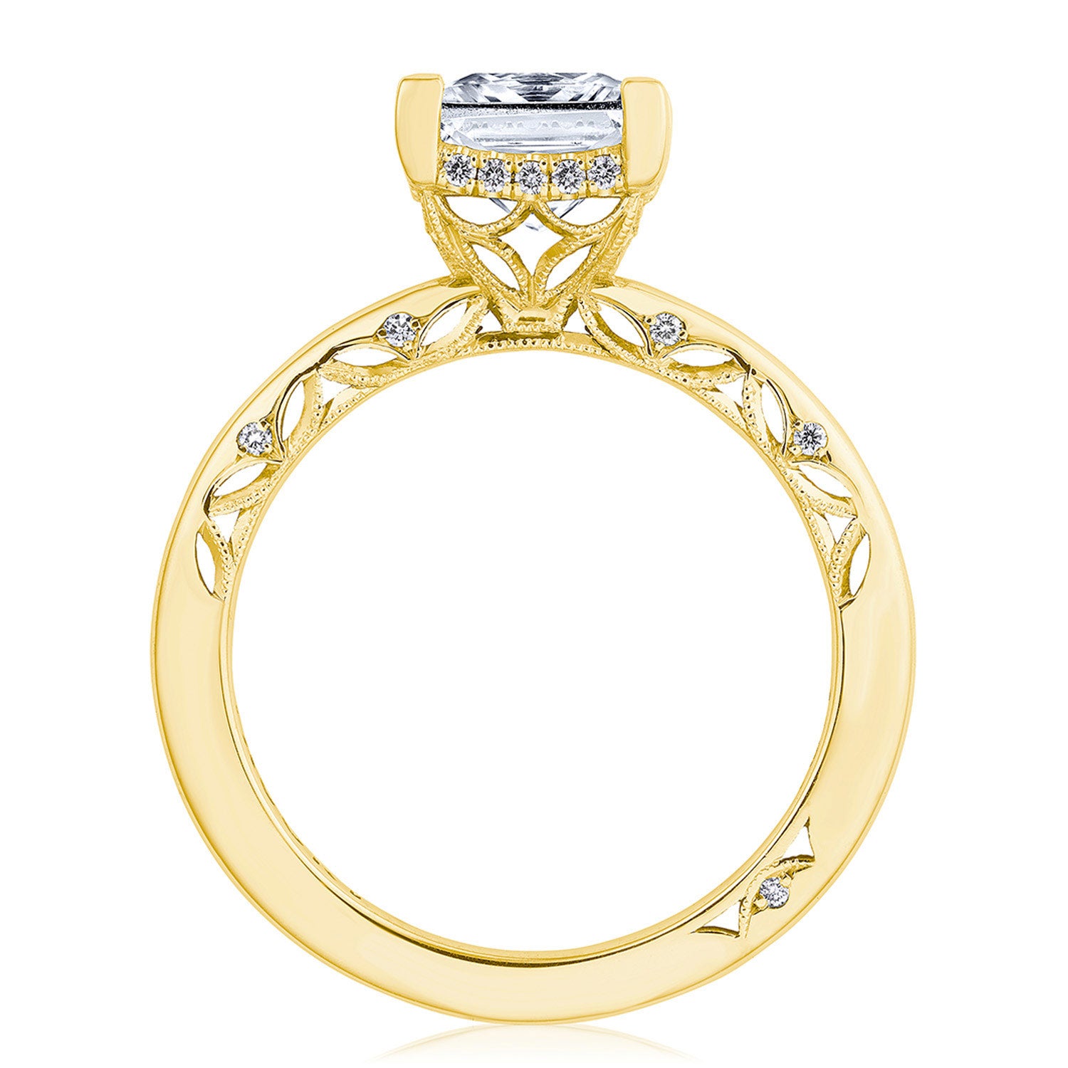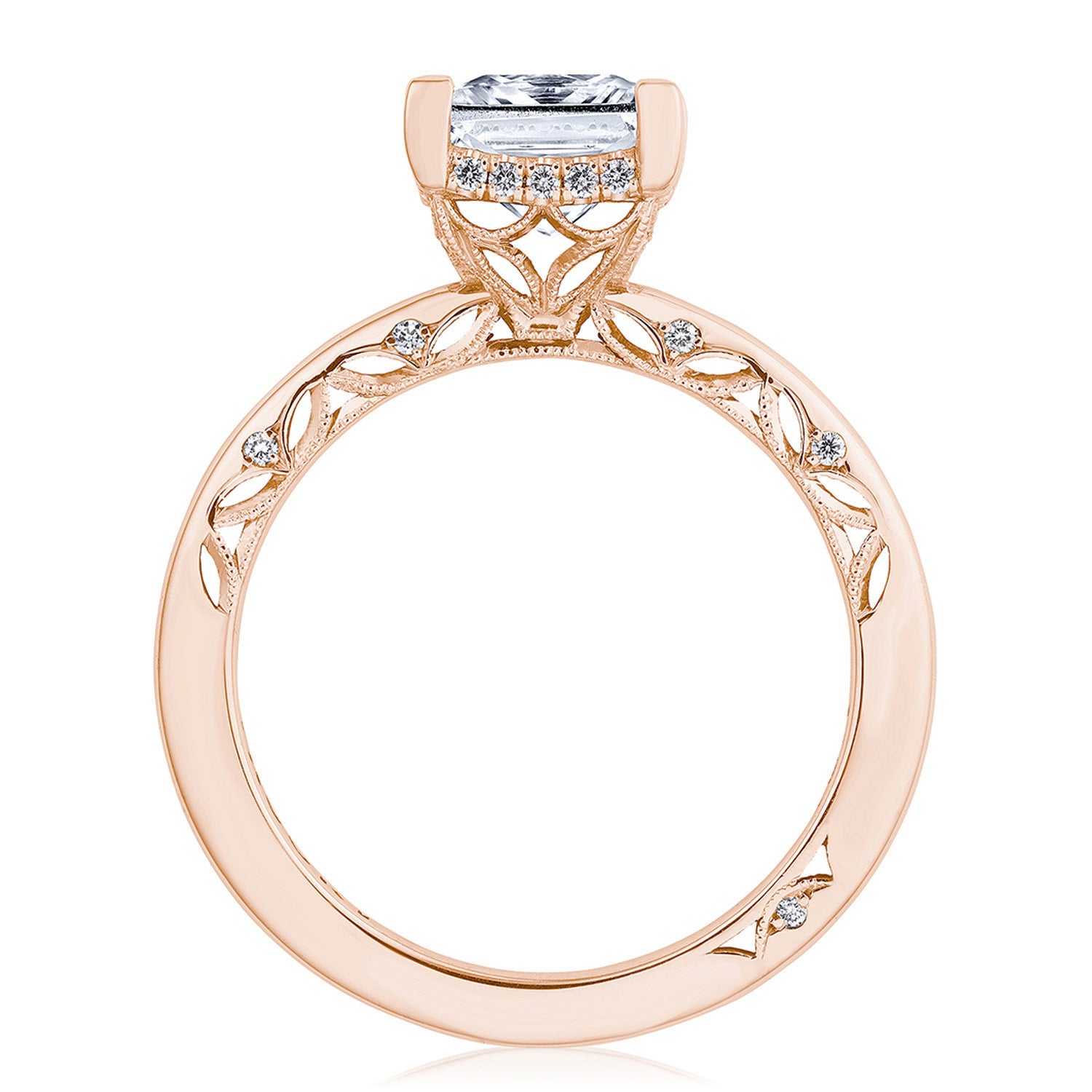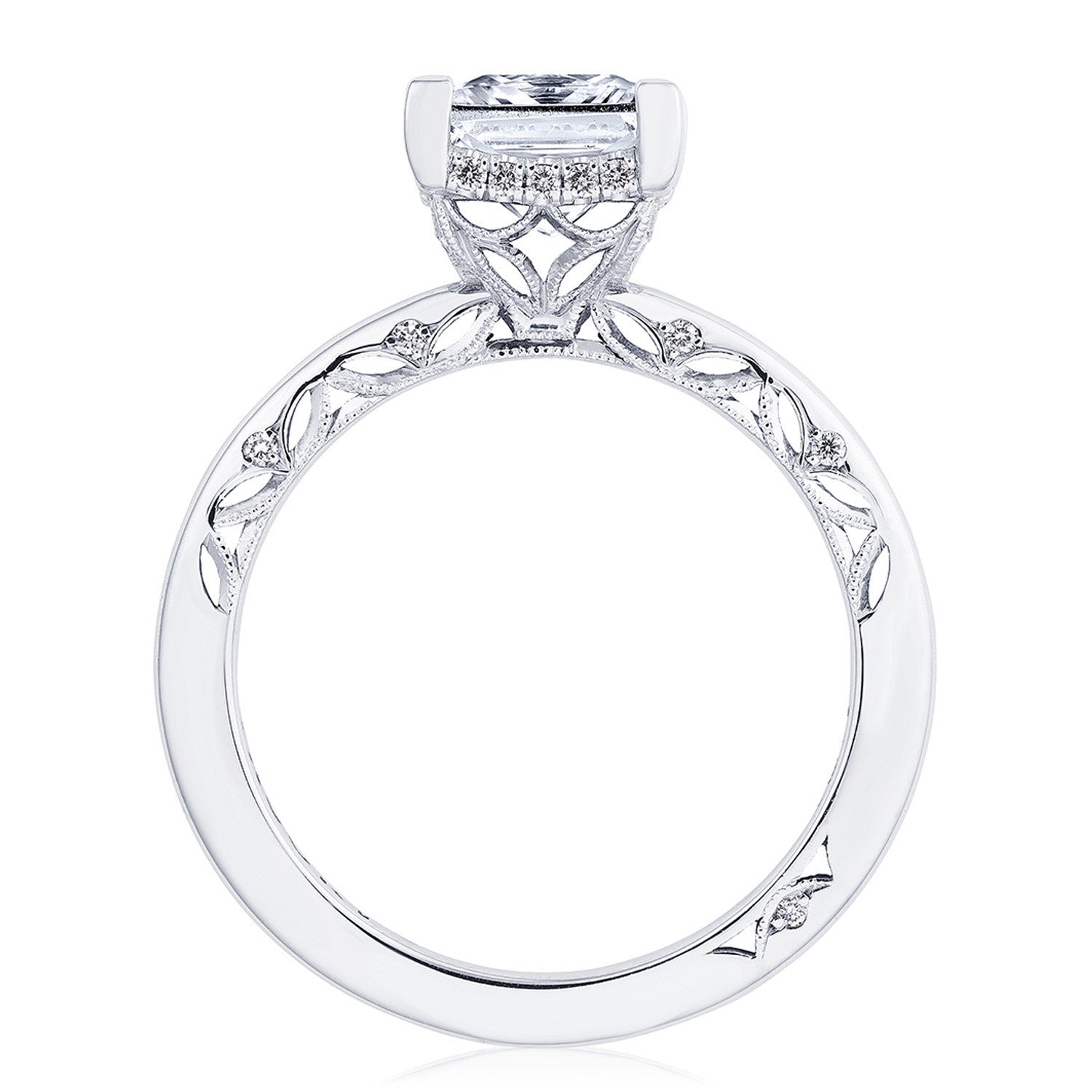 A high-polish ceiling accented with lace-like tracery makes for a stunningly airy setting. The hand-hewn milgrain and pinpoint diamonds add nuance, while a hidden bloom creates dimensional light. A Signature Crescent marks the resting point.