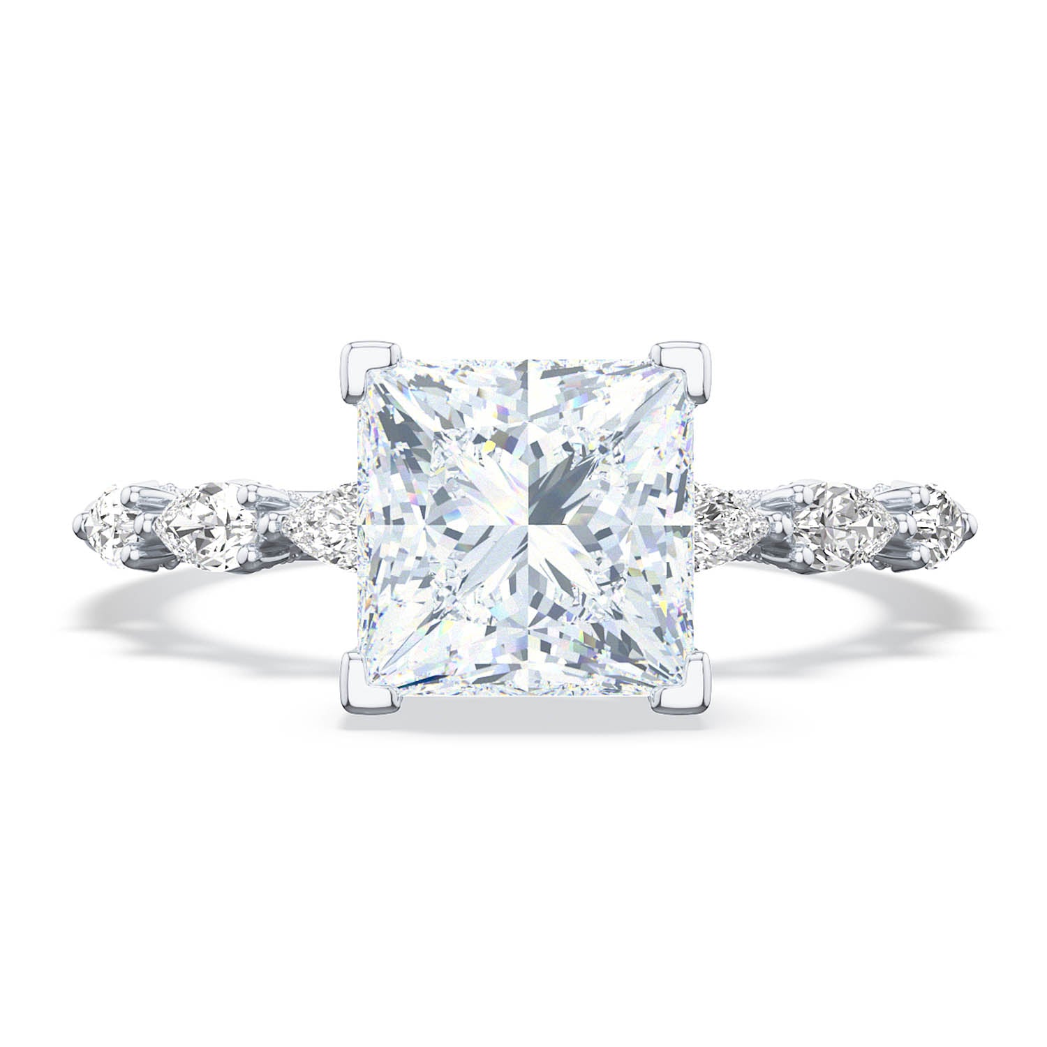 Pear side stones set in an East-West orentation highlight the center stone, which floats on a Classic 360 foundation above a hidden bloom. Sculpted Crescent fabric decorates the innerface, and a Signature Crescent marks the resting point.
