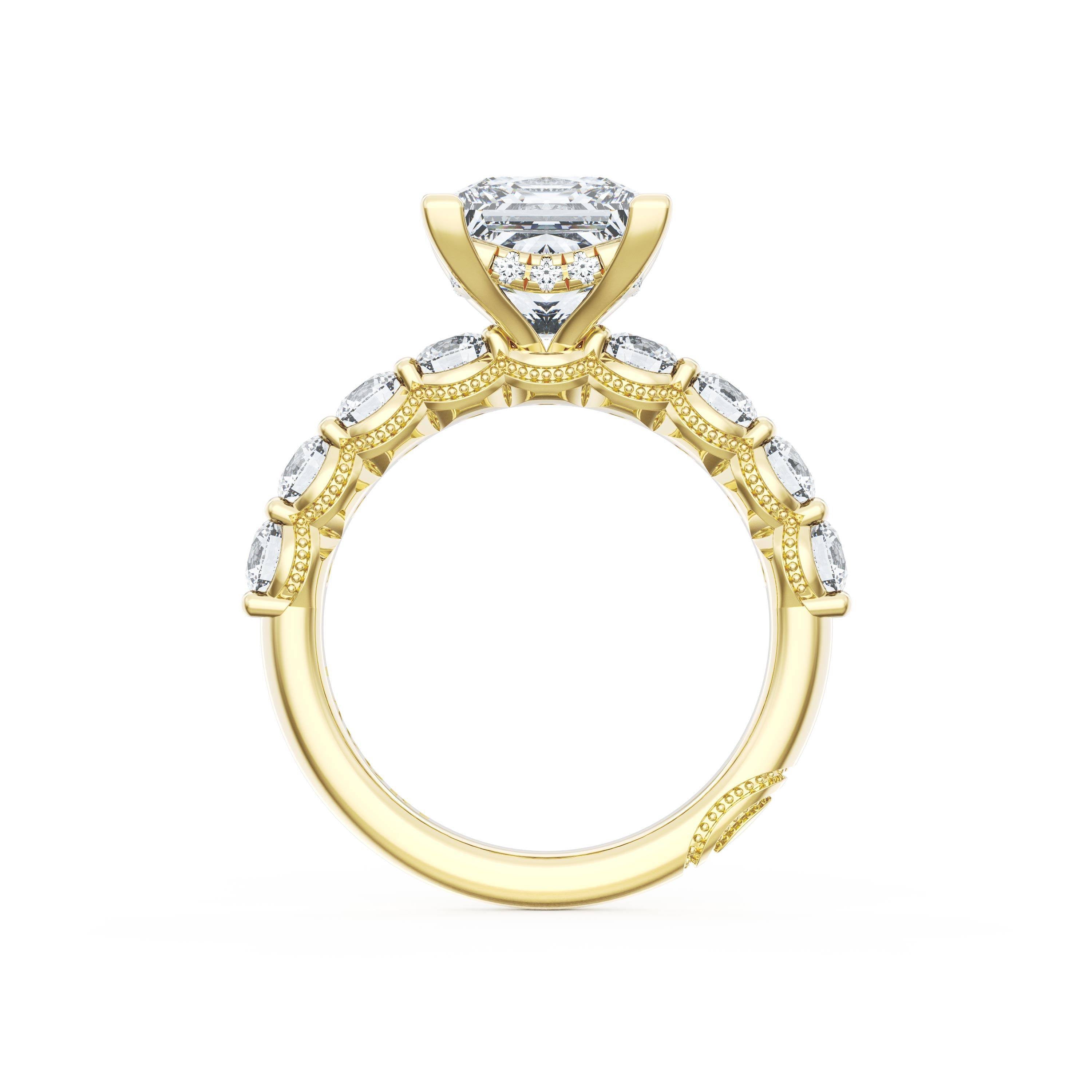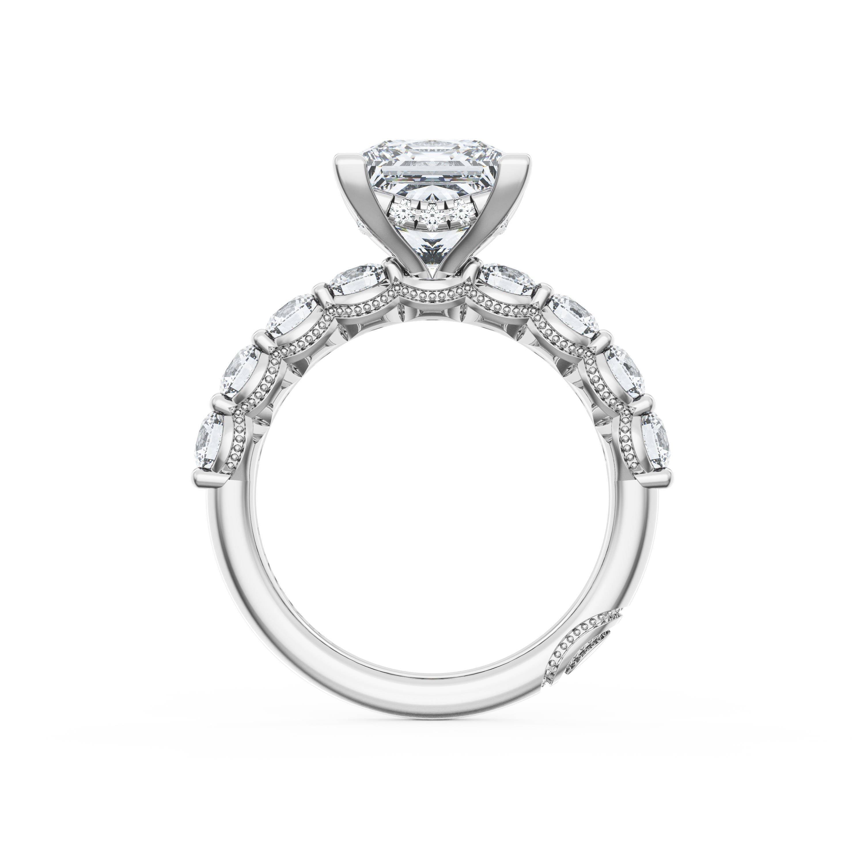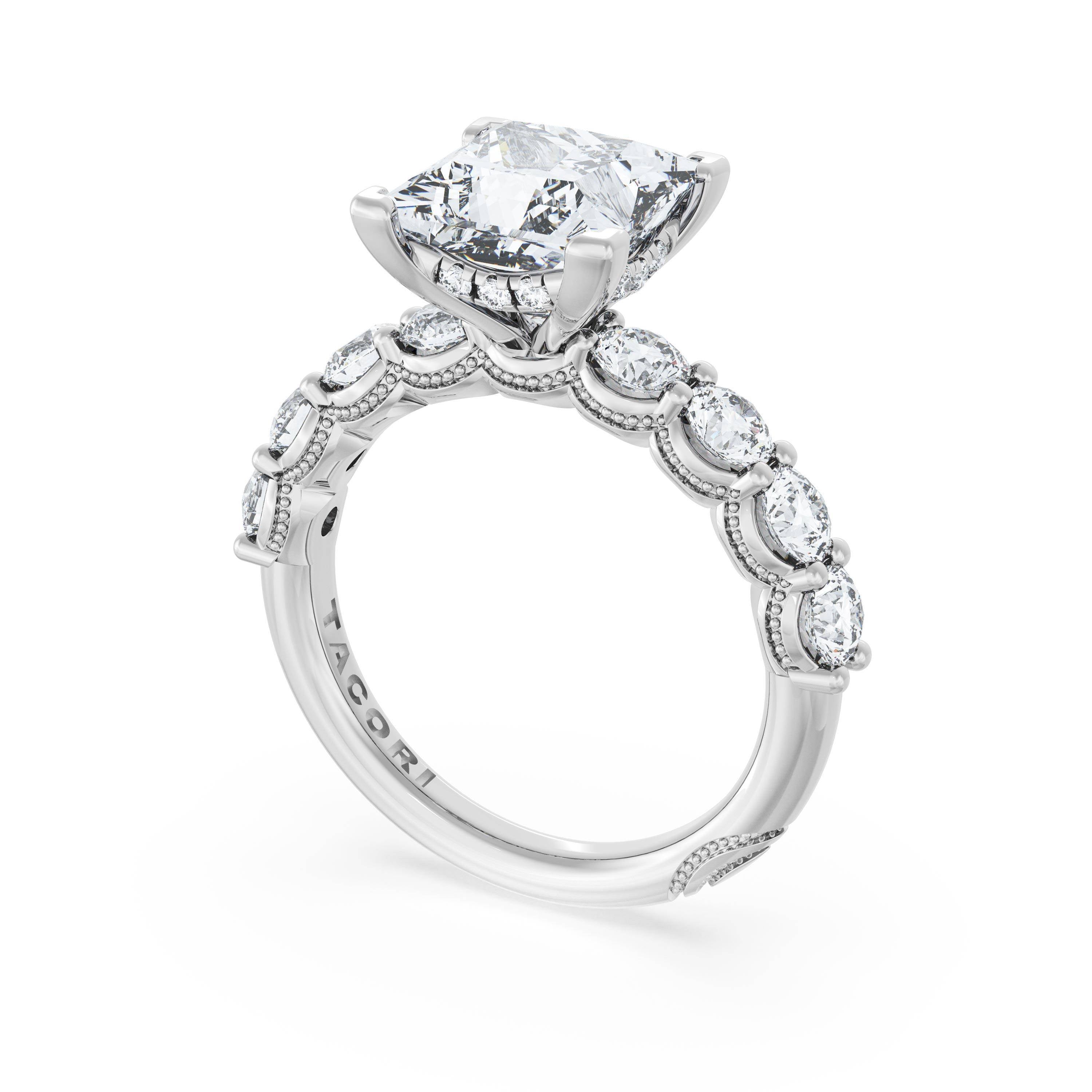 Eight round brilliant side stones decorate the ceiling of this Princess cut solitaire. A hidden bloom and milgrain Crescents on the silhouette add hidden detail.