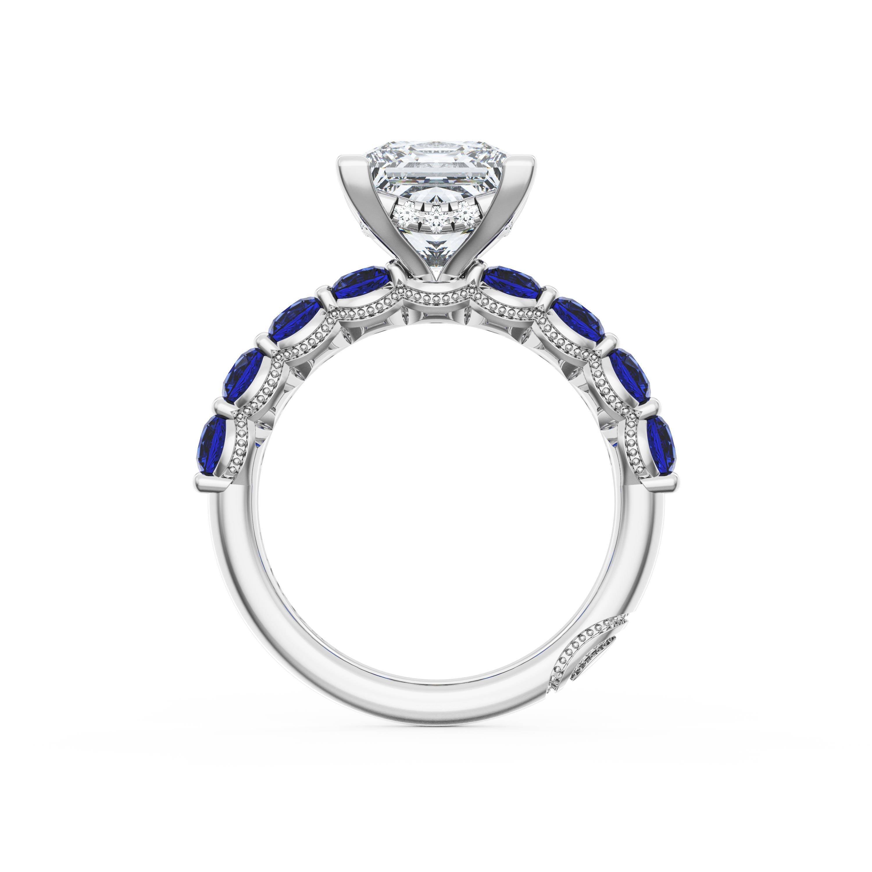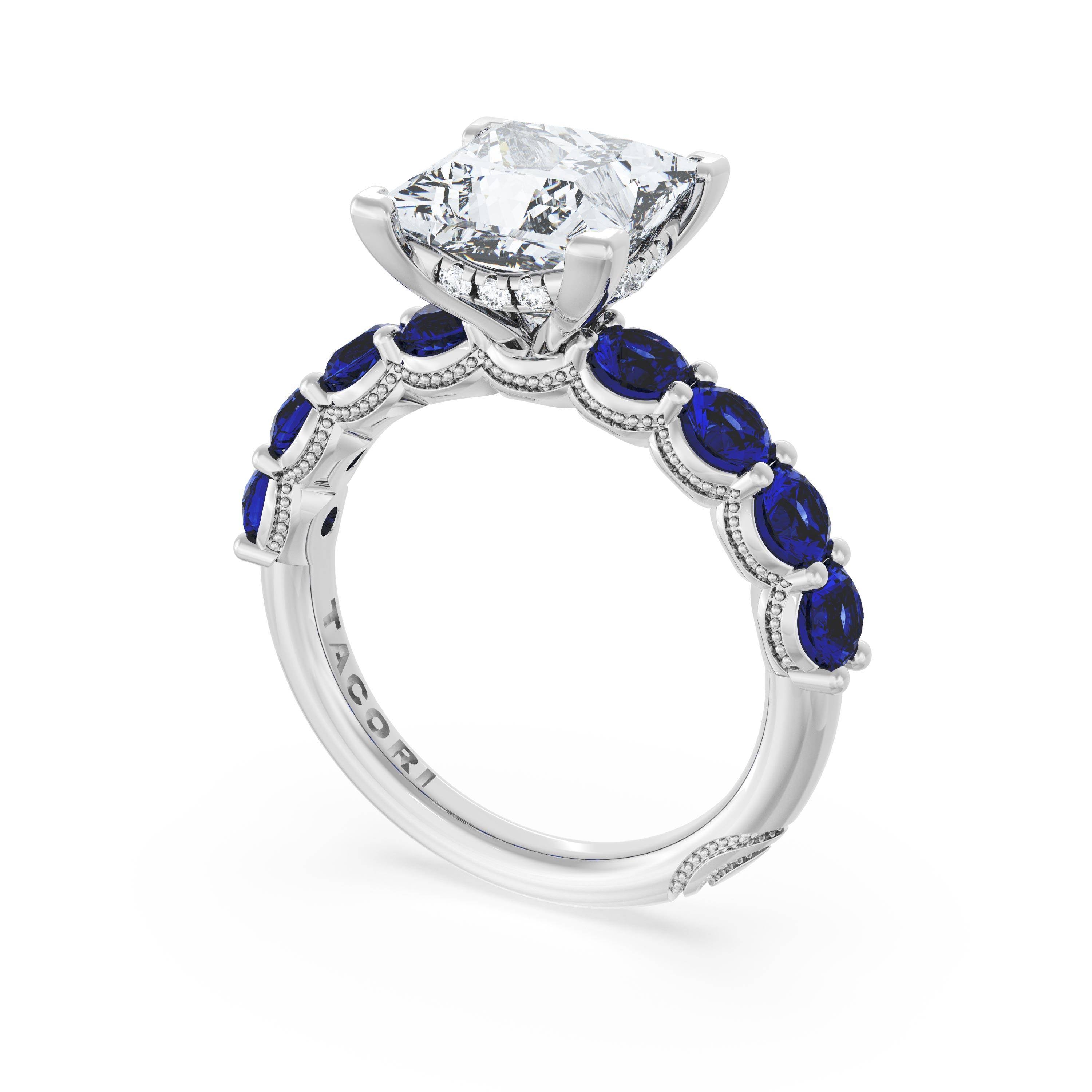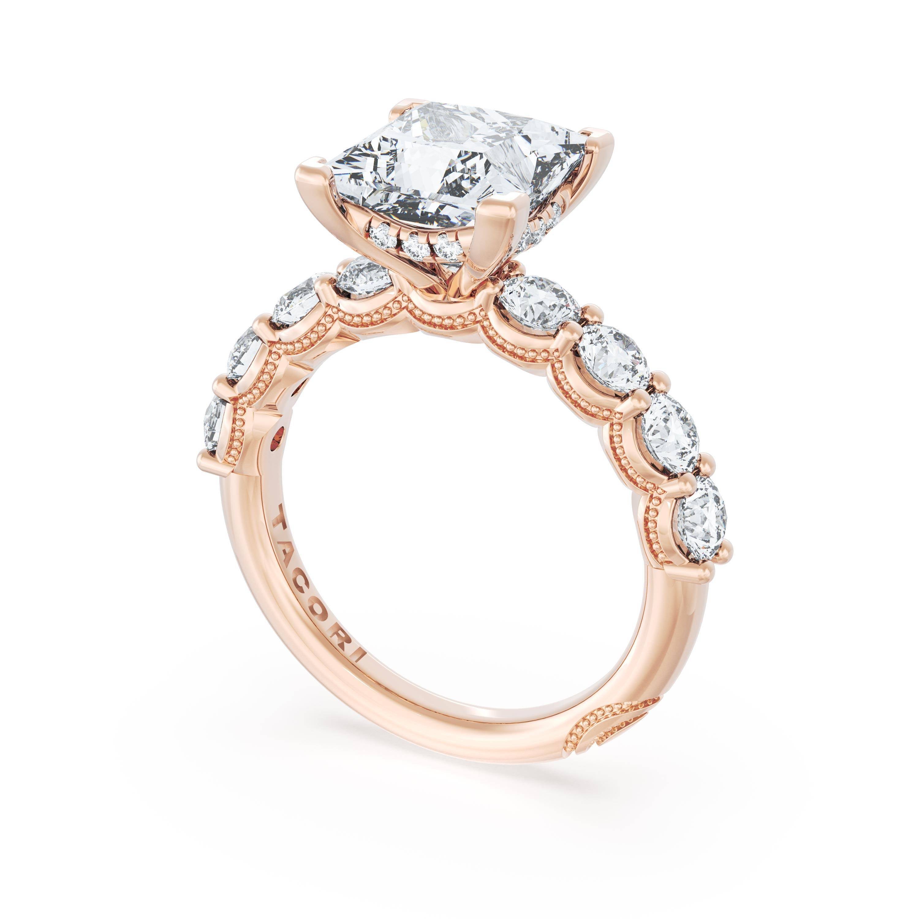 Eight round brilliant side stones decorate the ceiling of this Princess cut solitaire. A hidden bloom and milgrain Crescents on the silhouette add hidden detail.