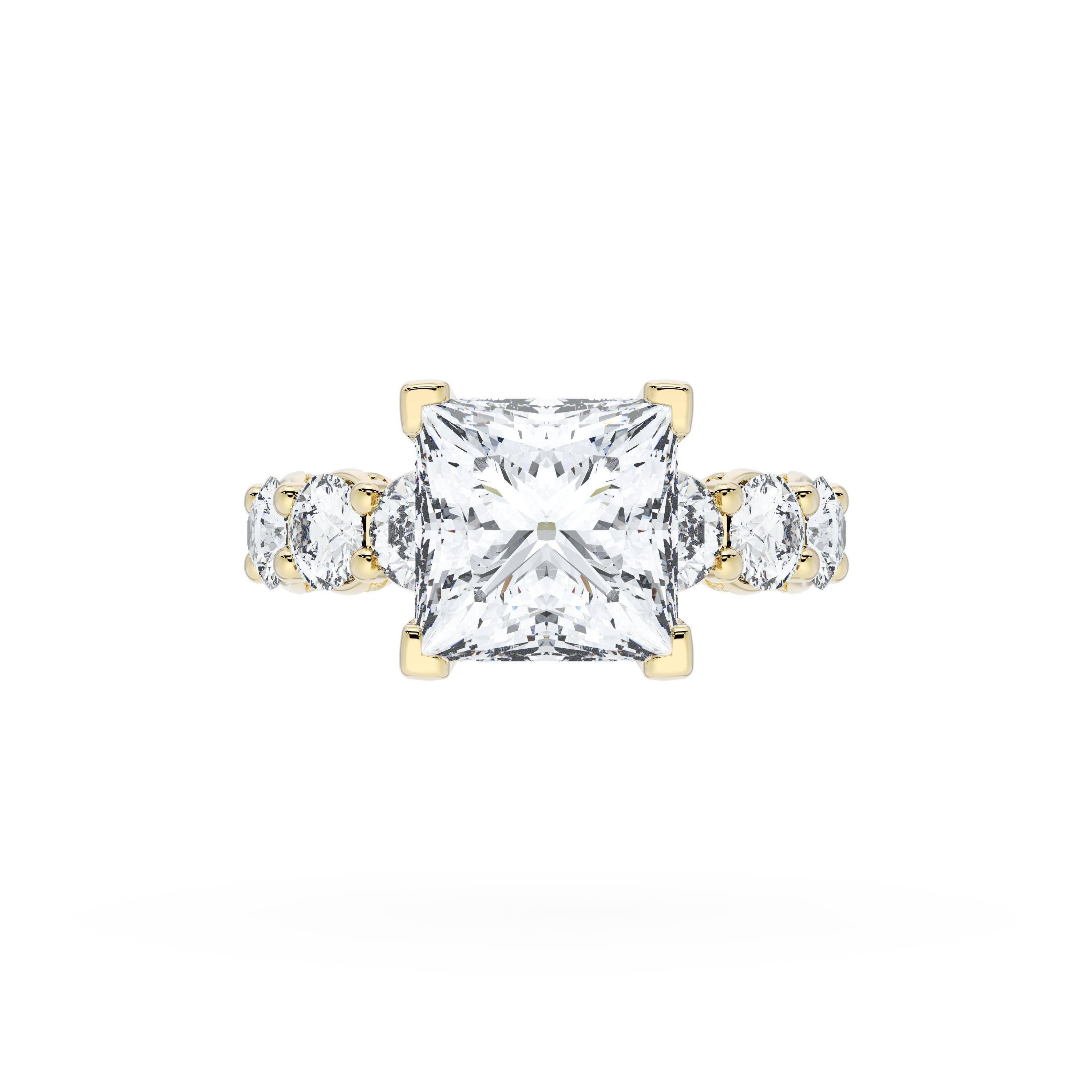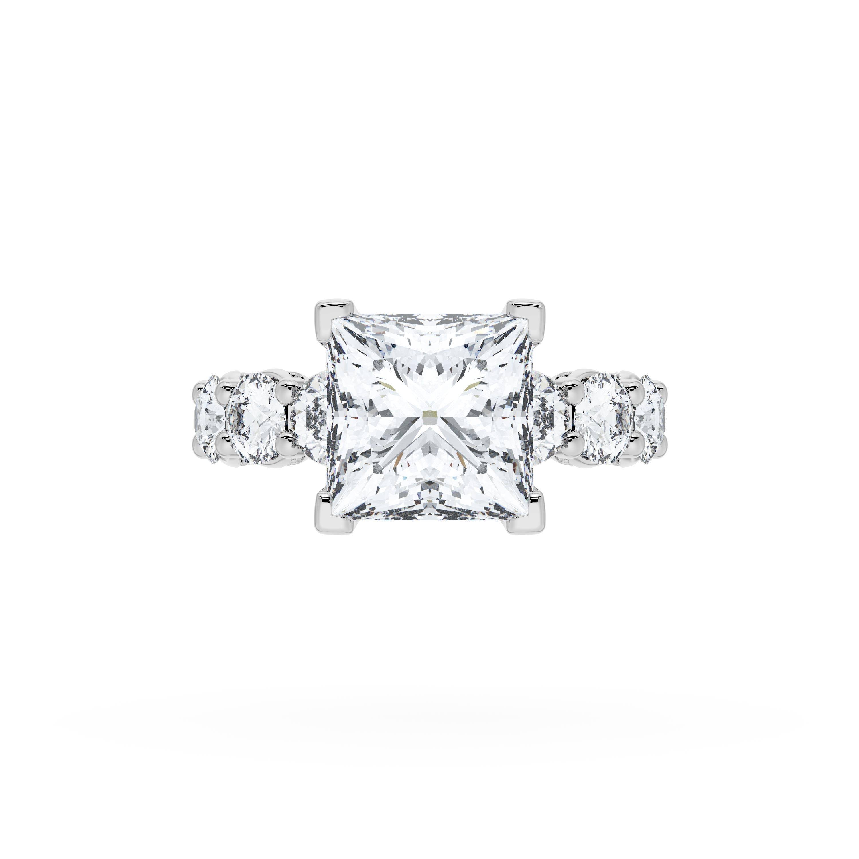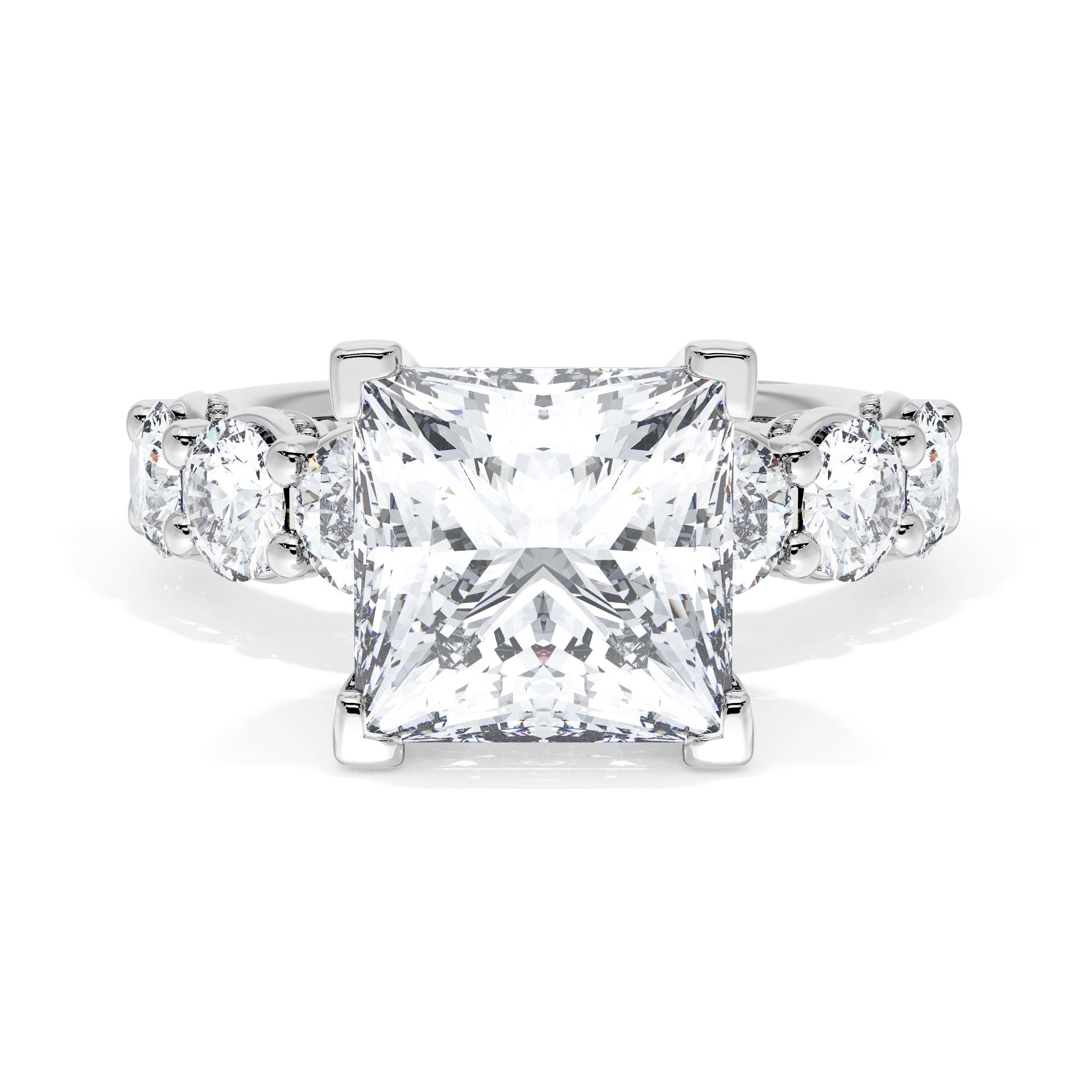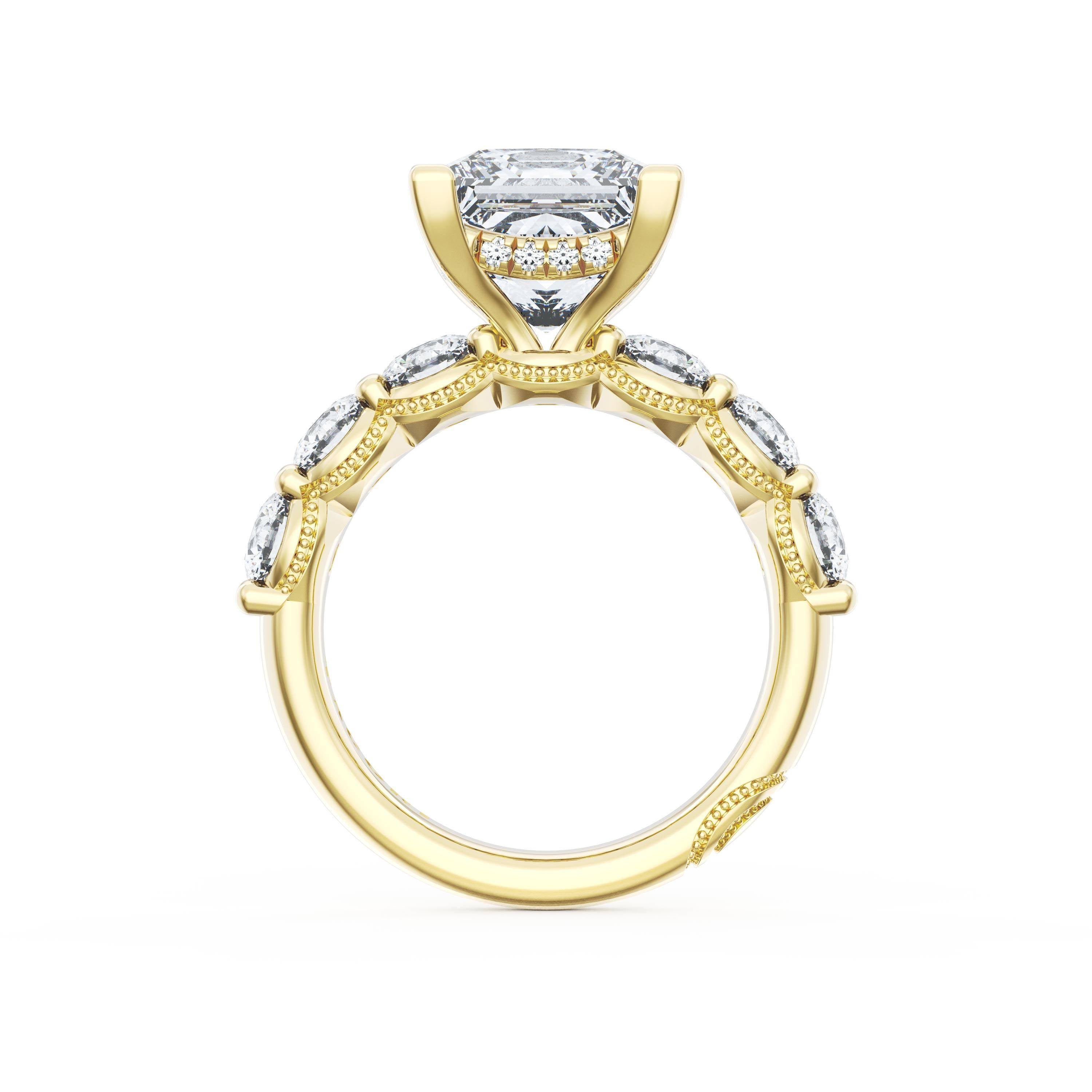 Six round brilliant side stones decorate the ceiling of this Princess cut solitaire. A hidden bloom and milgrain Crescents on the silhouette add hidden detail.