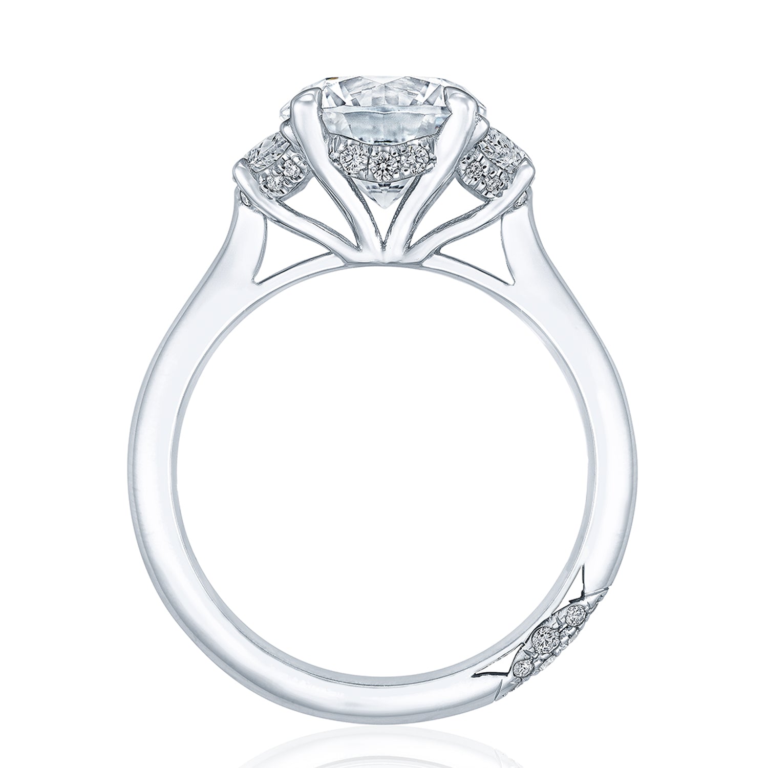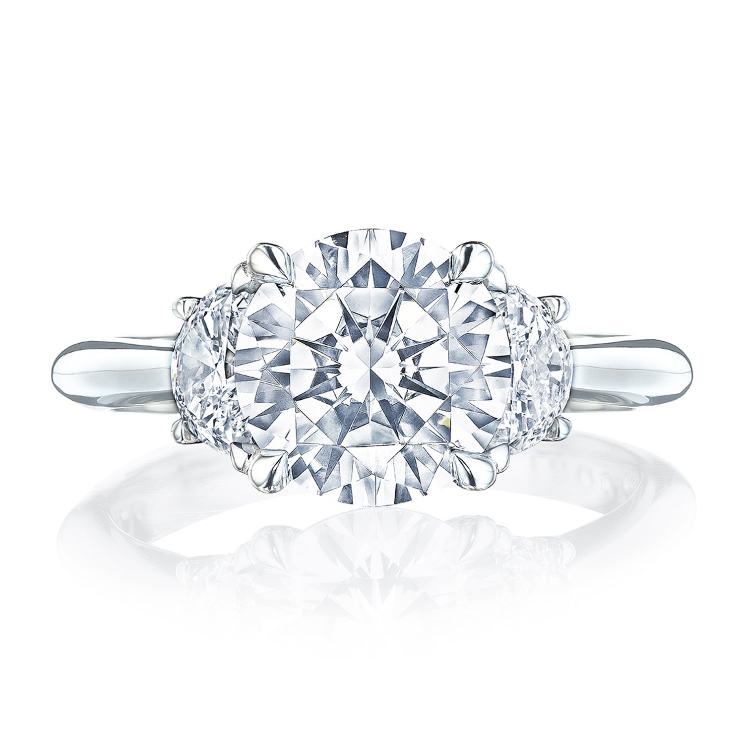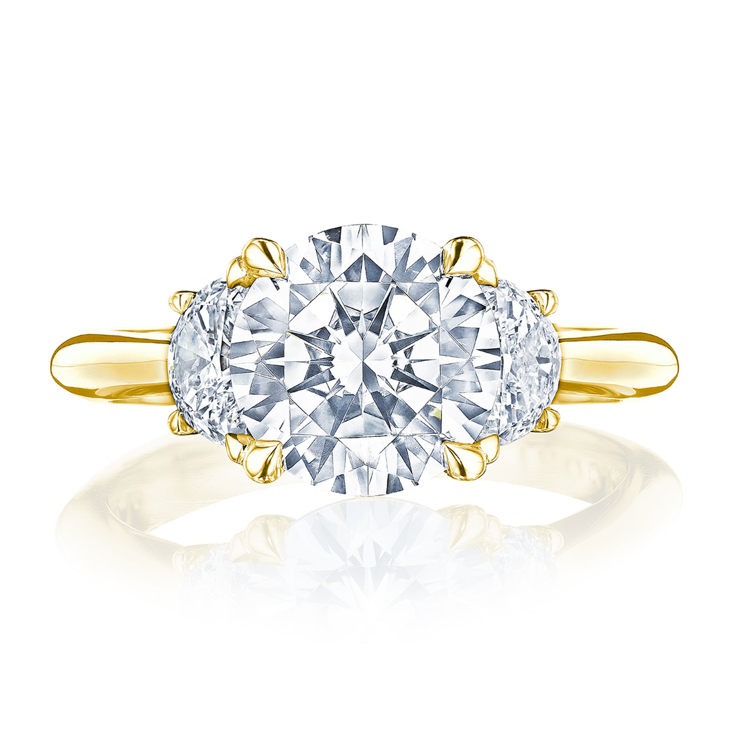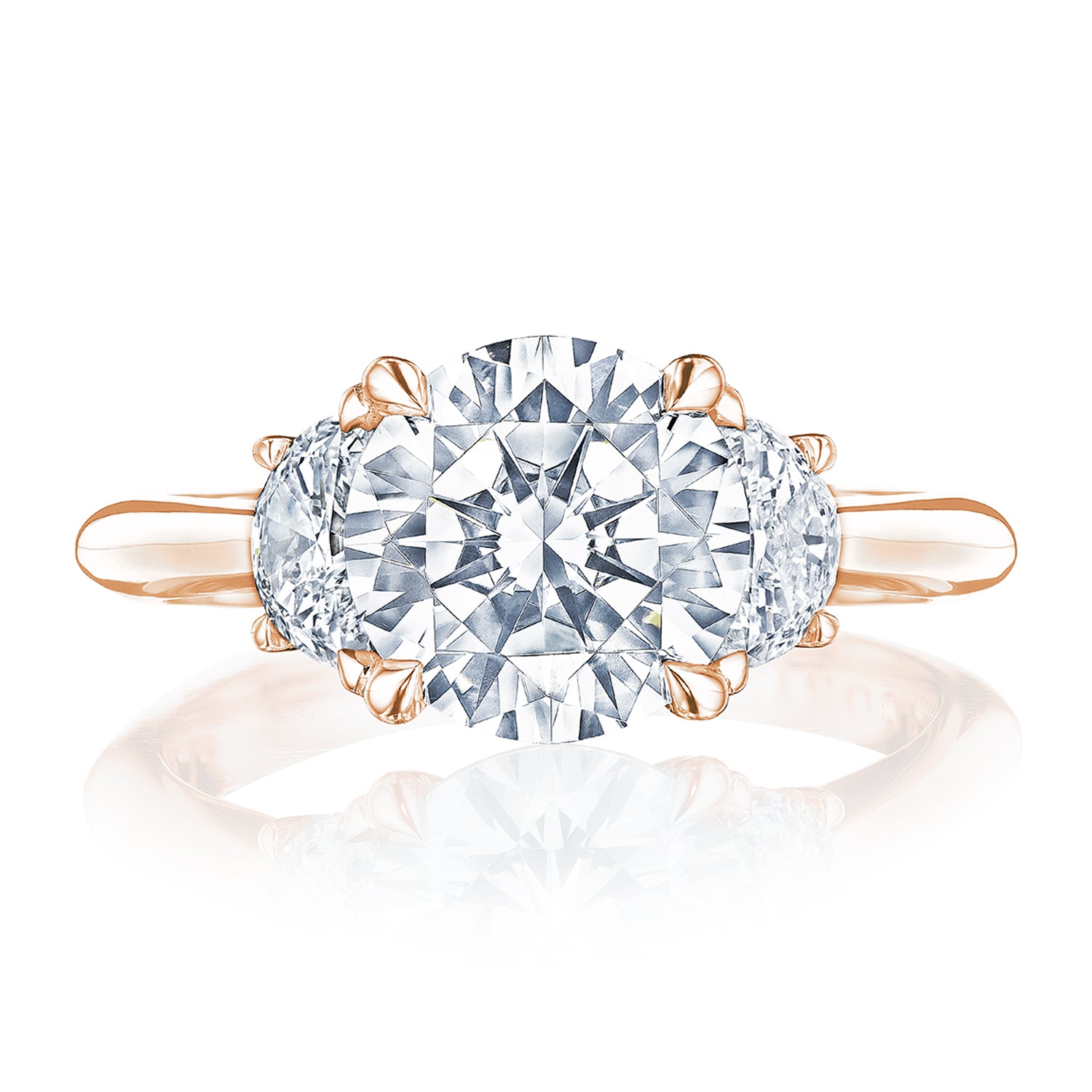 On a Cathedral foundation, two half-moon diamonds embrace the center stone. Hidden blooms add all-angle sparkle beneath the crown. The high-polish band is marked with a diamond-studded Founder's Crescent at the resting point.