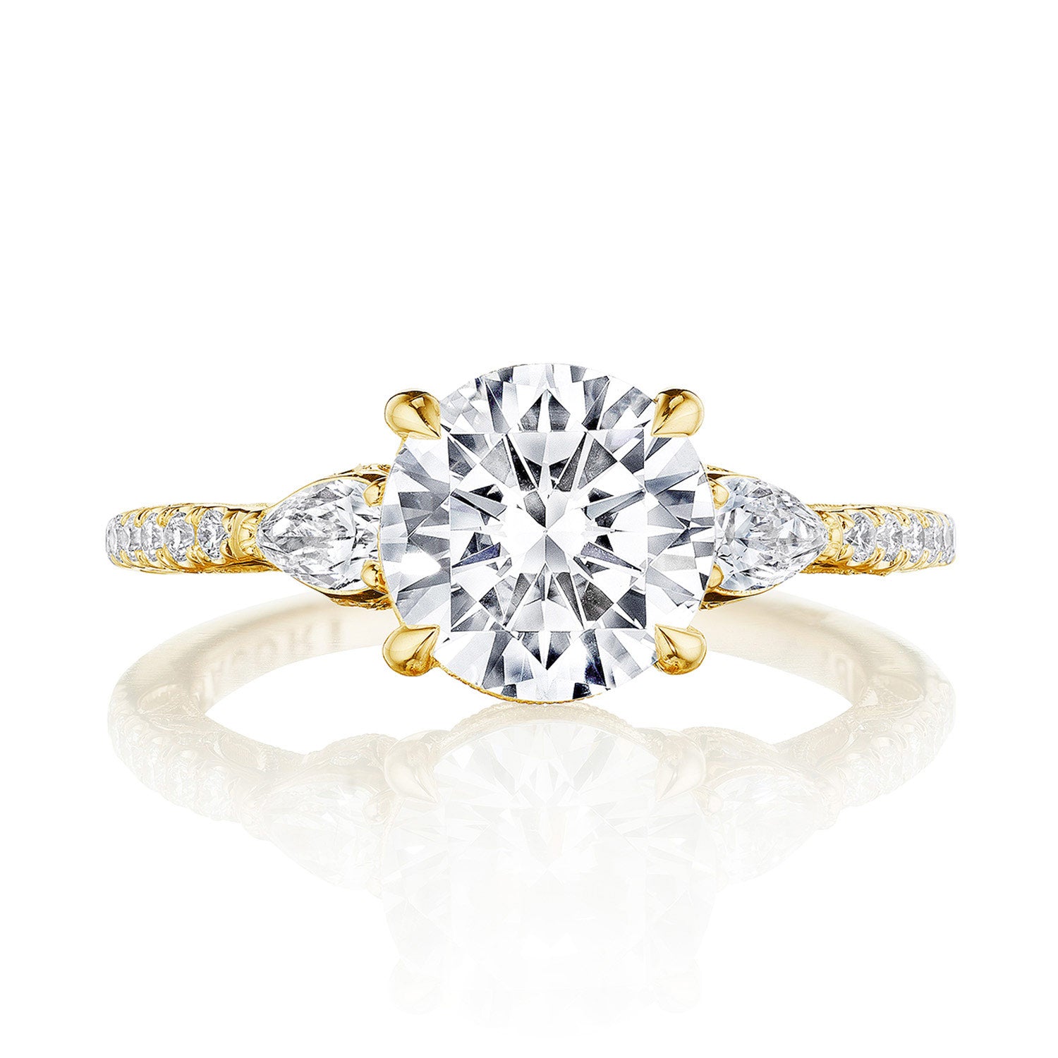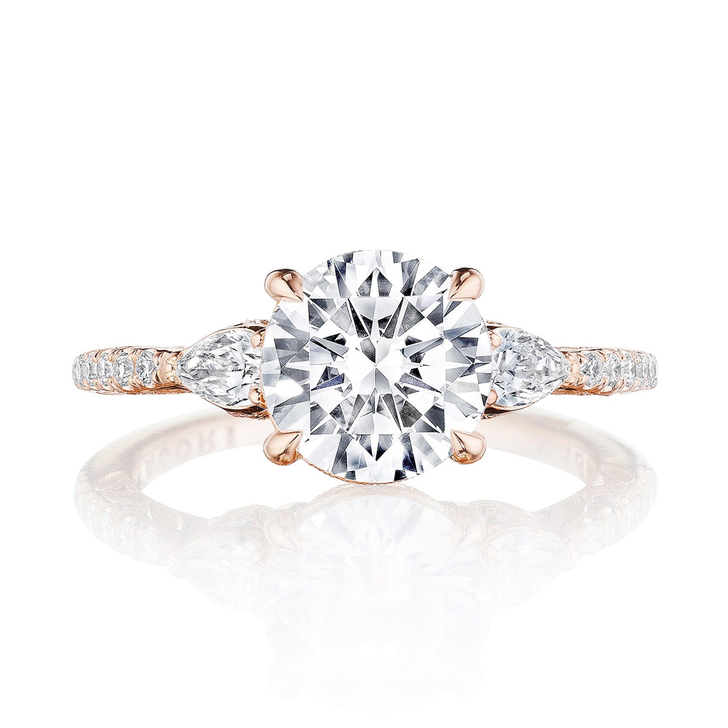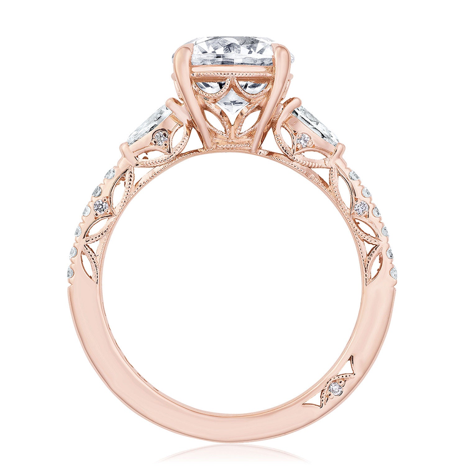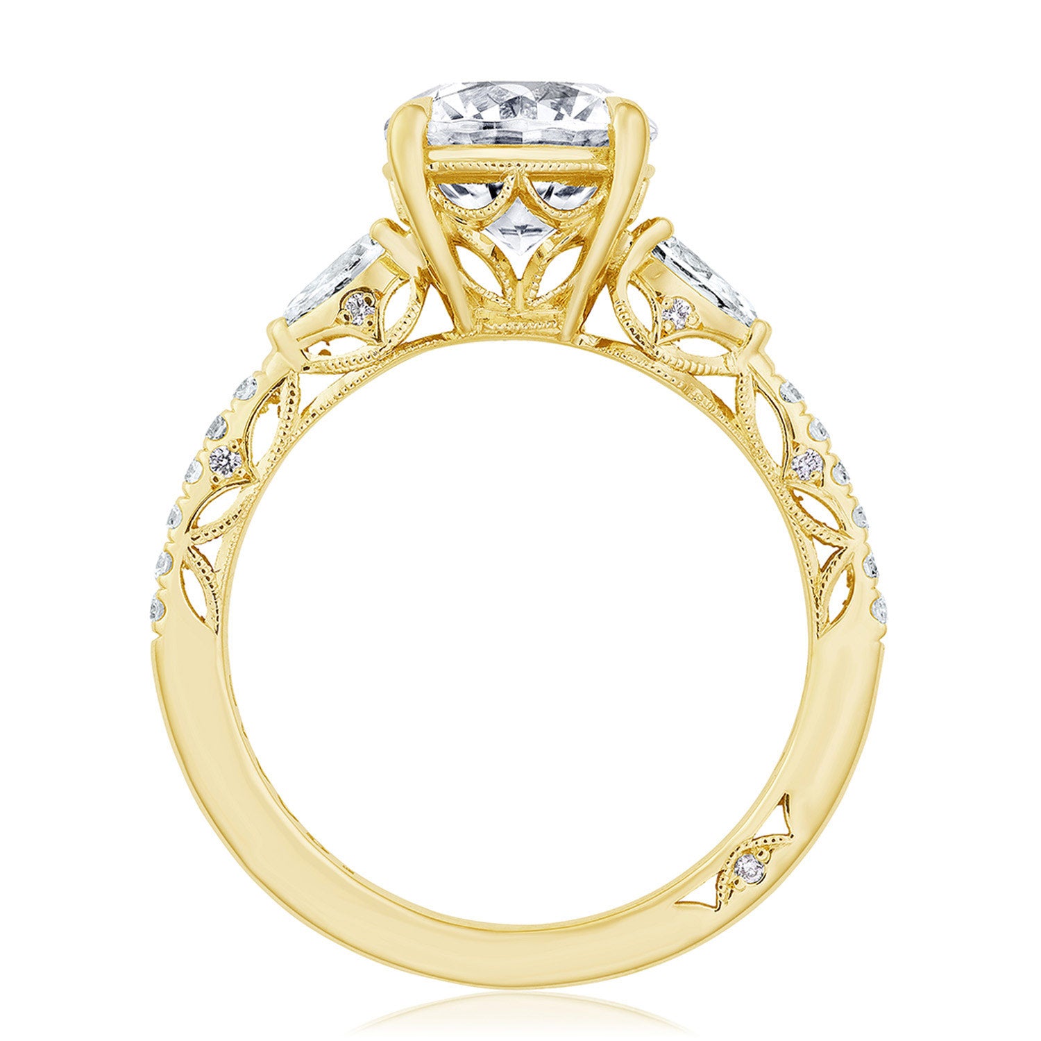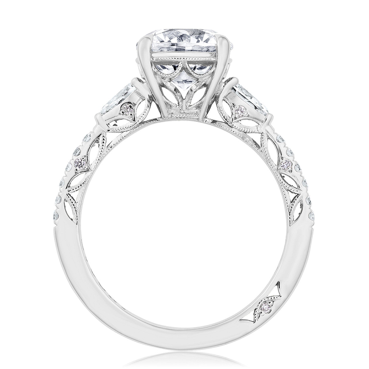 This three stone ring features distinctive pear side stones that sit atop a lace-like crown and foundation of complex, milgrain-edged Dantela Crescent Fabric. Meticulous, hand-set French pavé leads up the ceiling for eye-catching brilliance.