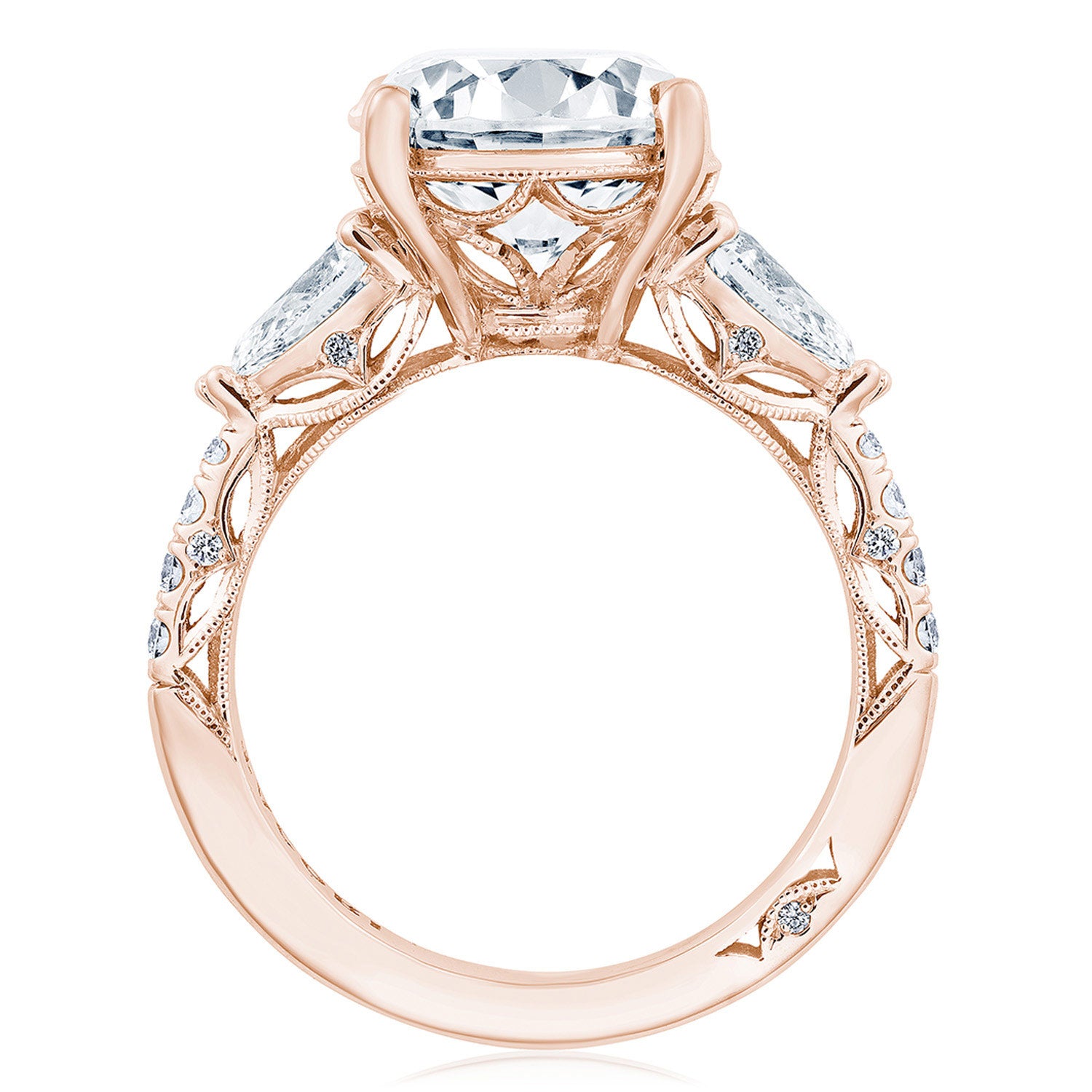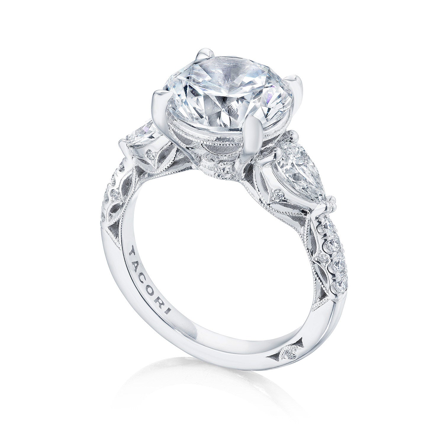 This three stone ring features distinctive pear side stones that sit atop a lace-like crown and foundation of complex, milgrain-edged Dantela Crescent Fabric. Meticulous, hand-set French pavé leads up the ceiling for eye-catching brilliance.