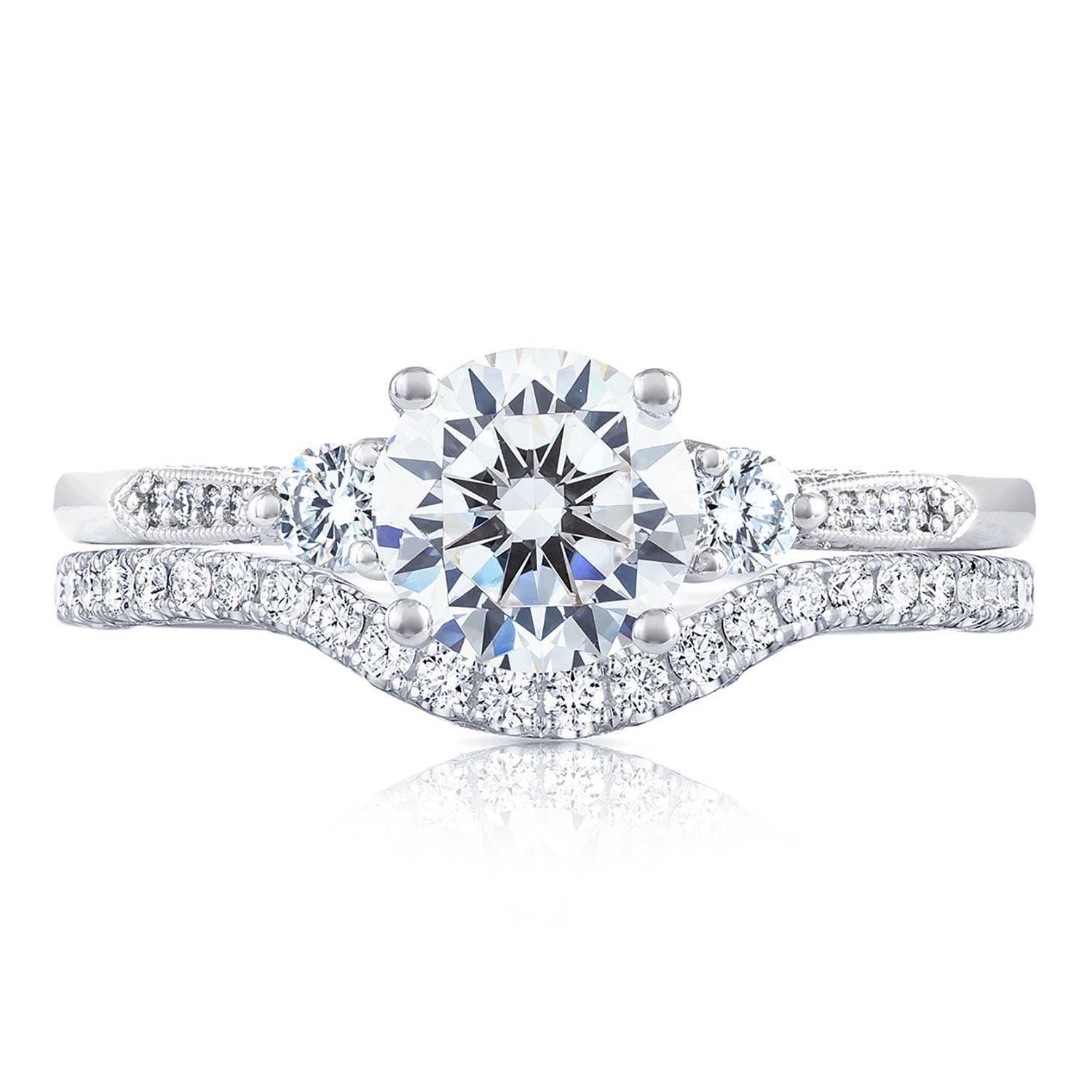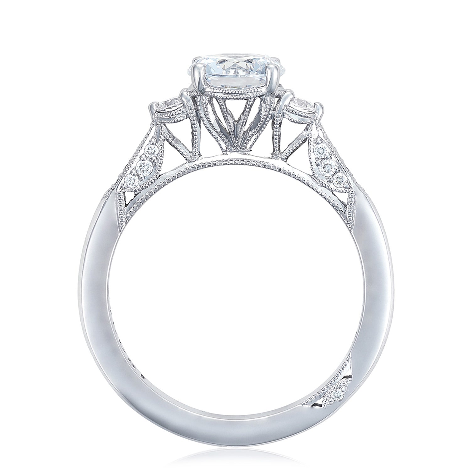 Two round-brilliant side stones and diamond pavé on the ceiling accentuate the solitaire, which sits on a milgrain-studded Cathedral foundation. Simply Tacori crescent fabric decorates the upper innerface of the ring with more dimond detailing.