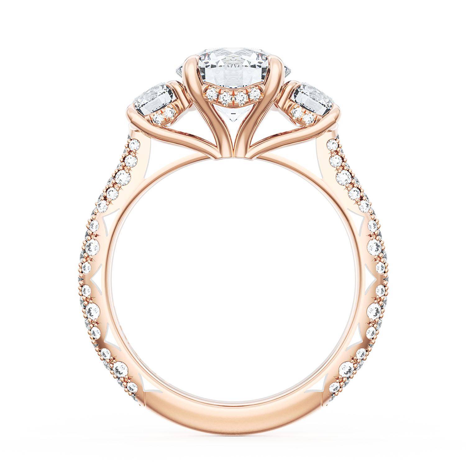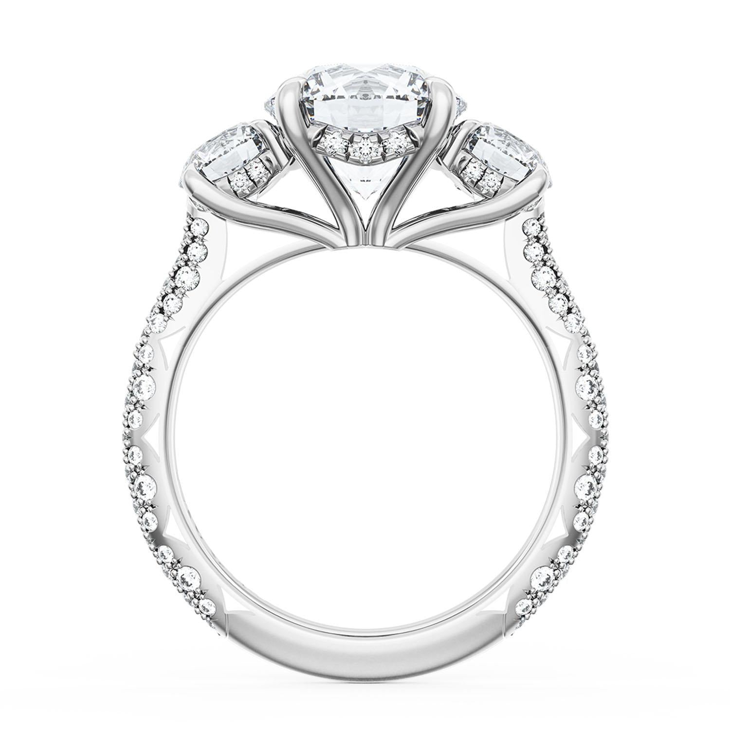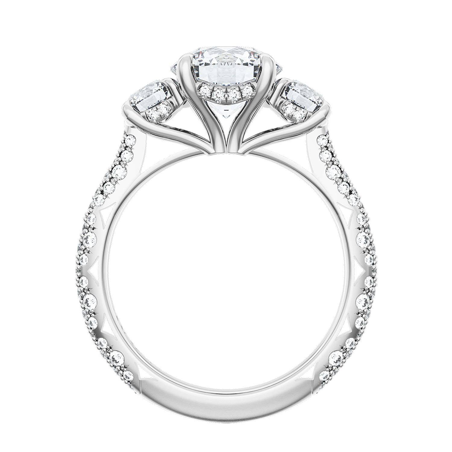 This 3-stone ring features a round brilliant center and matching round side stones, each accented with a hidden bloom. The Founder's Crescent Fabric wraps around the ceiling of the ring and continues for 3/4 diamond coverage.