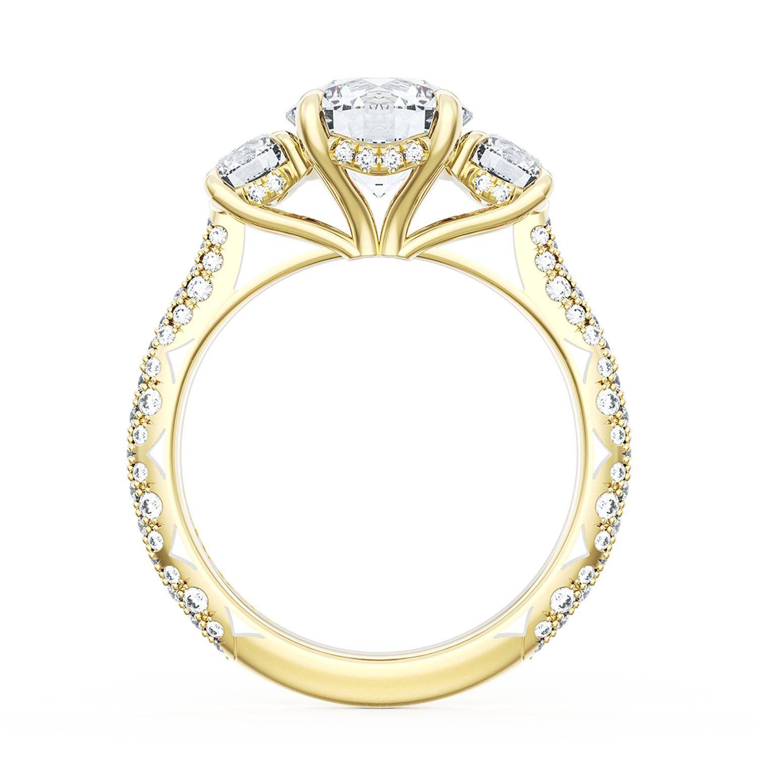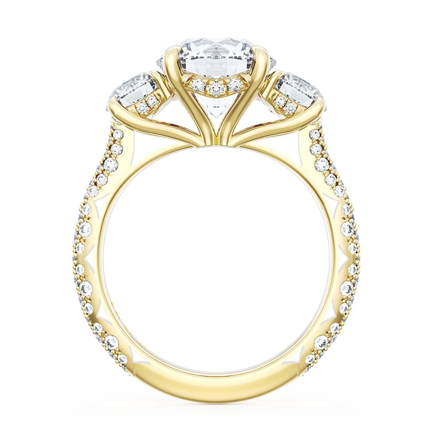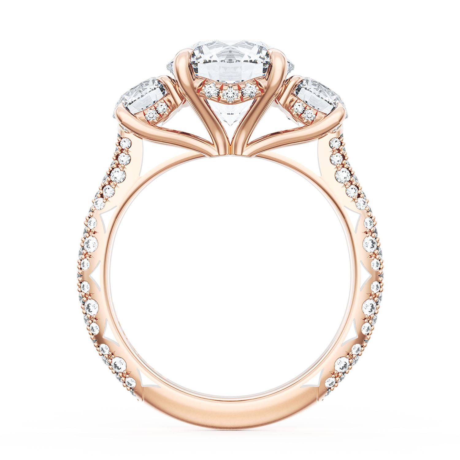 This 3-stone ring features a round brilliant center and matching round side stones, each accented with a hidden bloom. The Founder's Crescent Fabric wraps around the ceiling of the ring and continues for 3/4 diamond coverage.