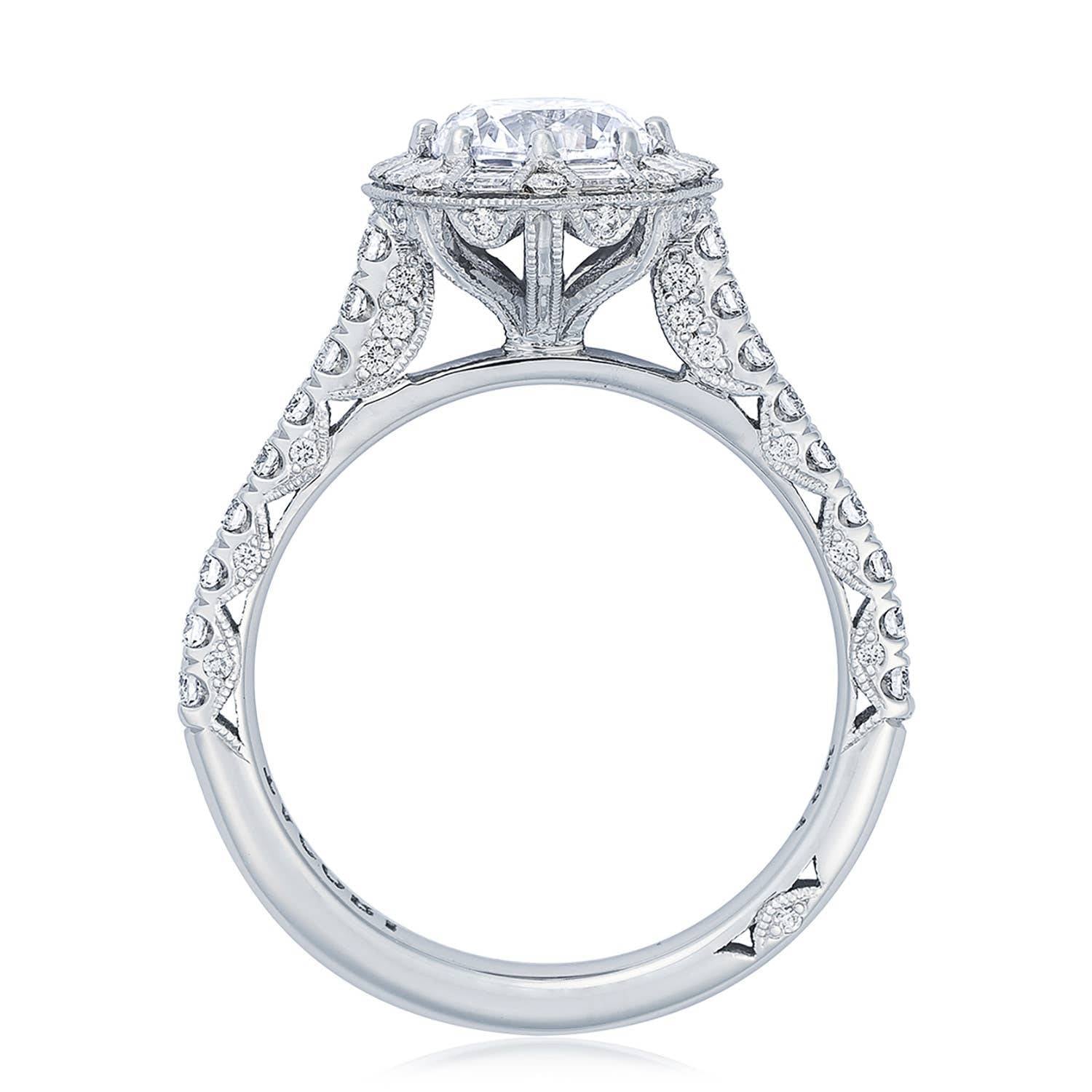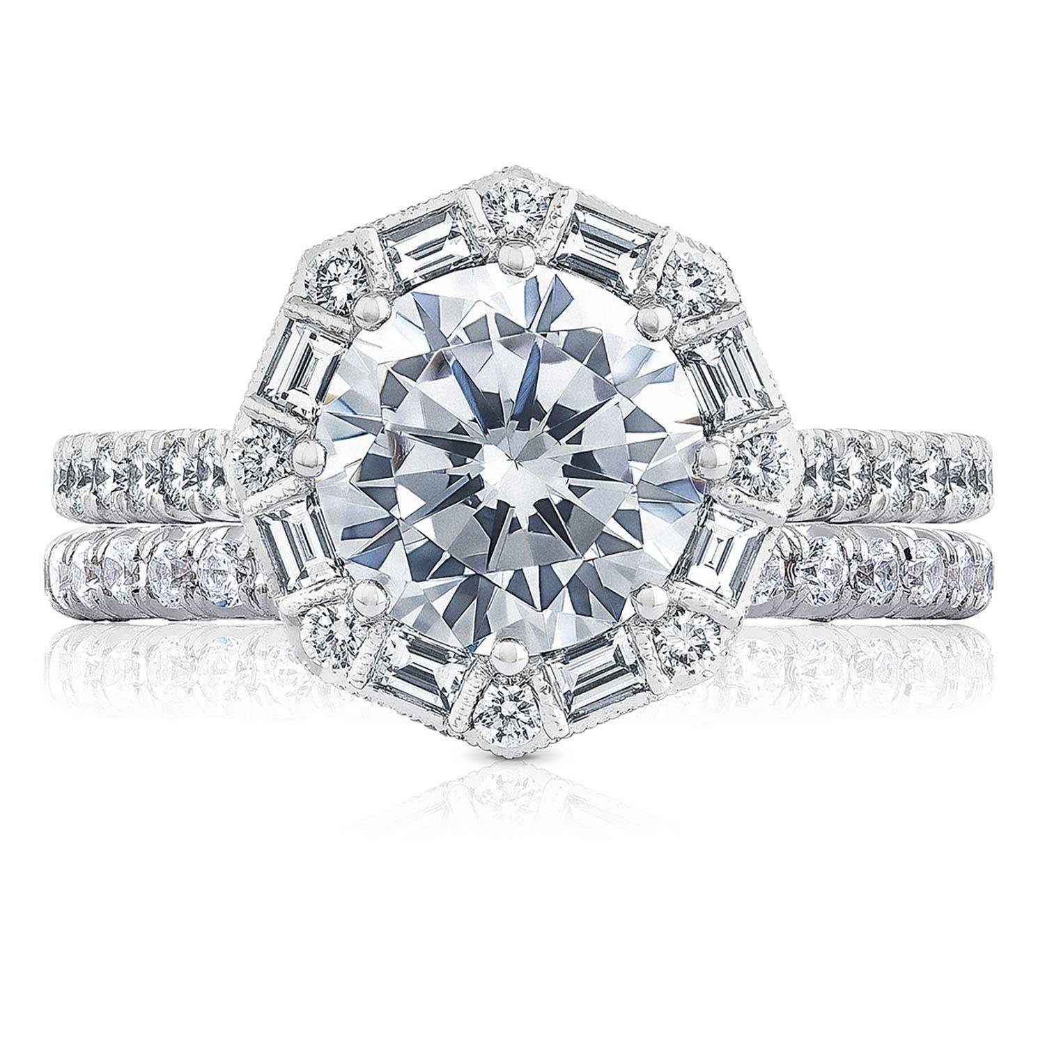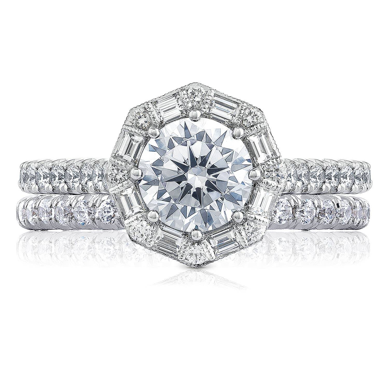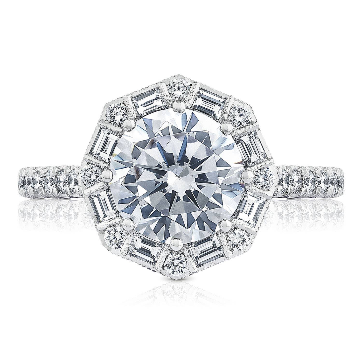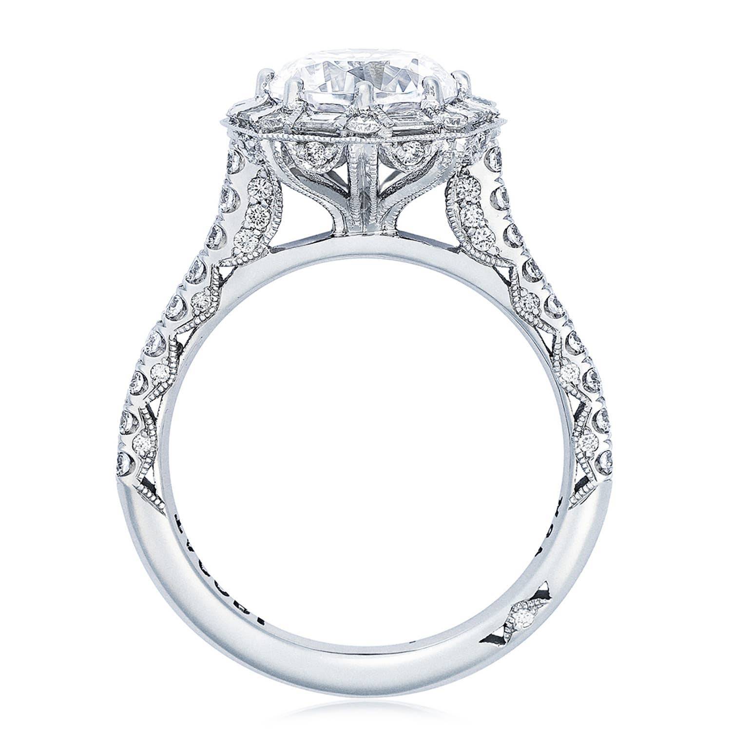 Pave-set diamonds run up the ceiling to the centerston, which is bloomed with baguette-shape diamonds. The crown sits on an intricate Cathedral foundation, while diamond-studded Petite Crescent fabric decorates the innerface.