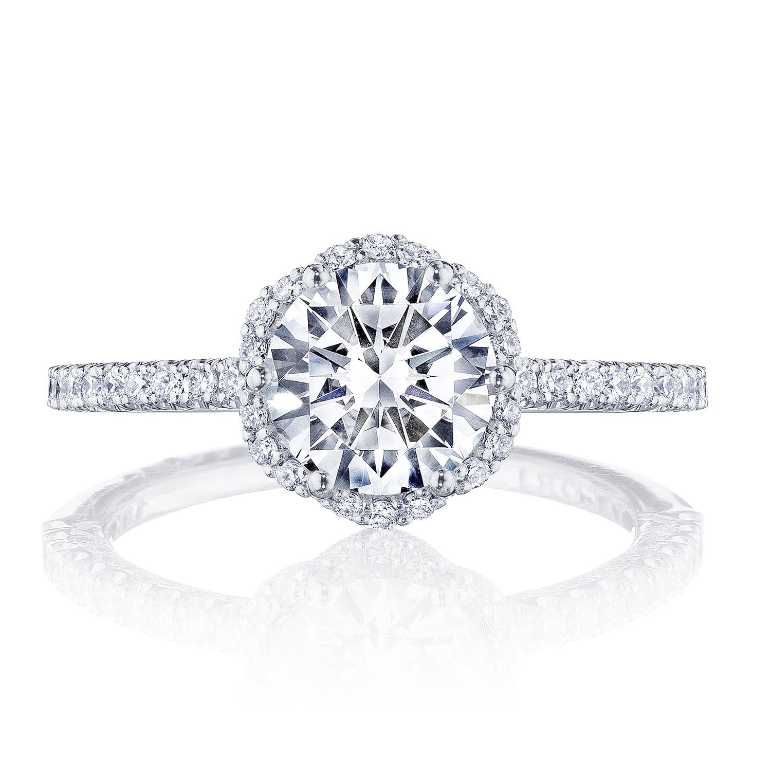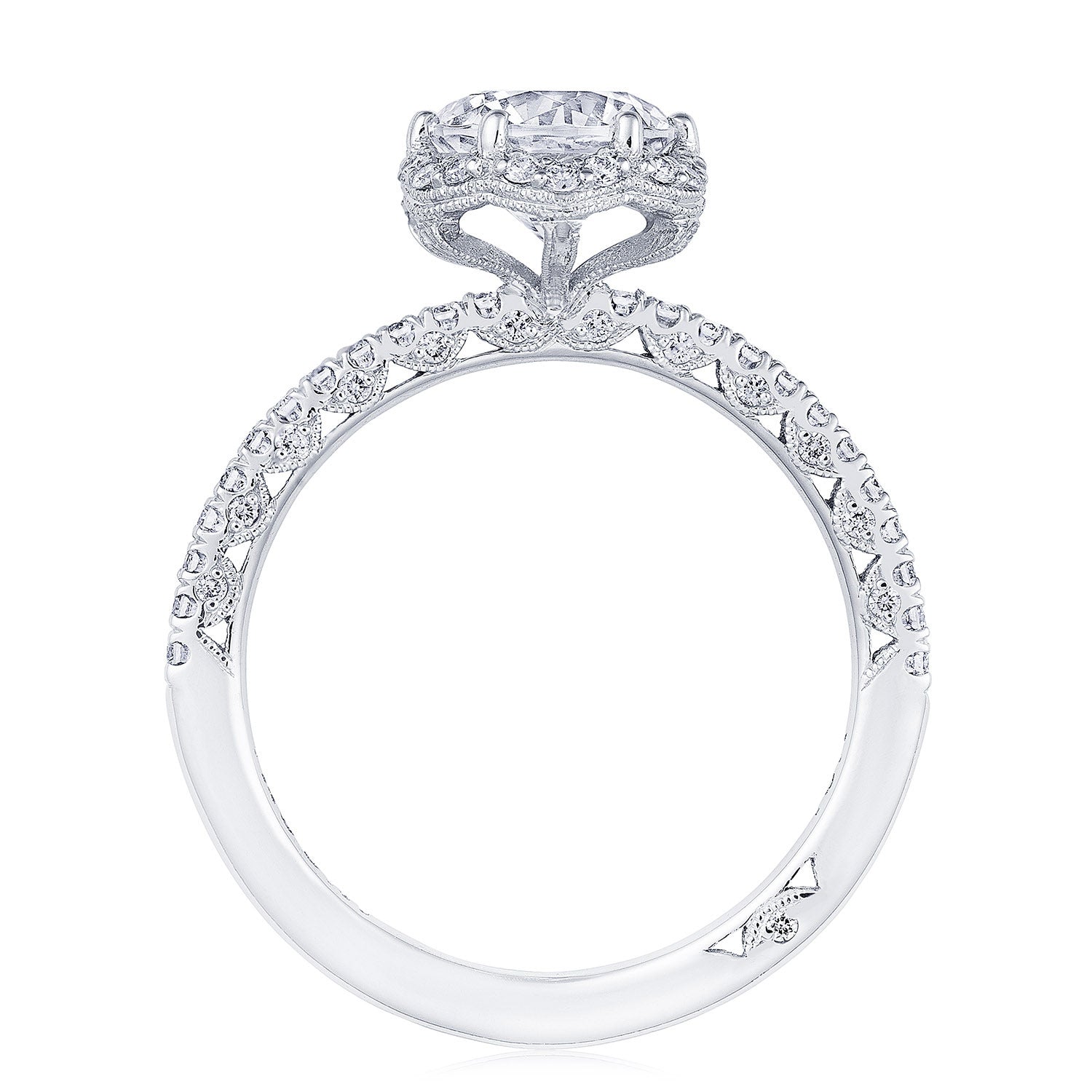Pave-set diamonds decorate the ceiling, while a round bloom adds dimension to the center stone. The crown floats on a Classic 360 foundation above a band of Petite Crescent with more diamond details. A Signature Crescent marks the resting point.
