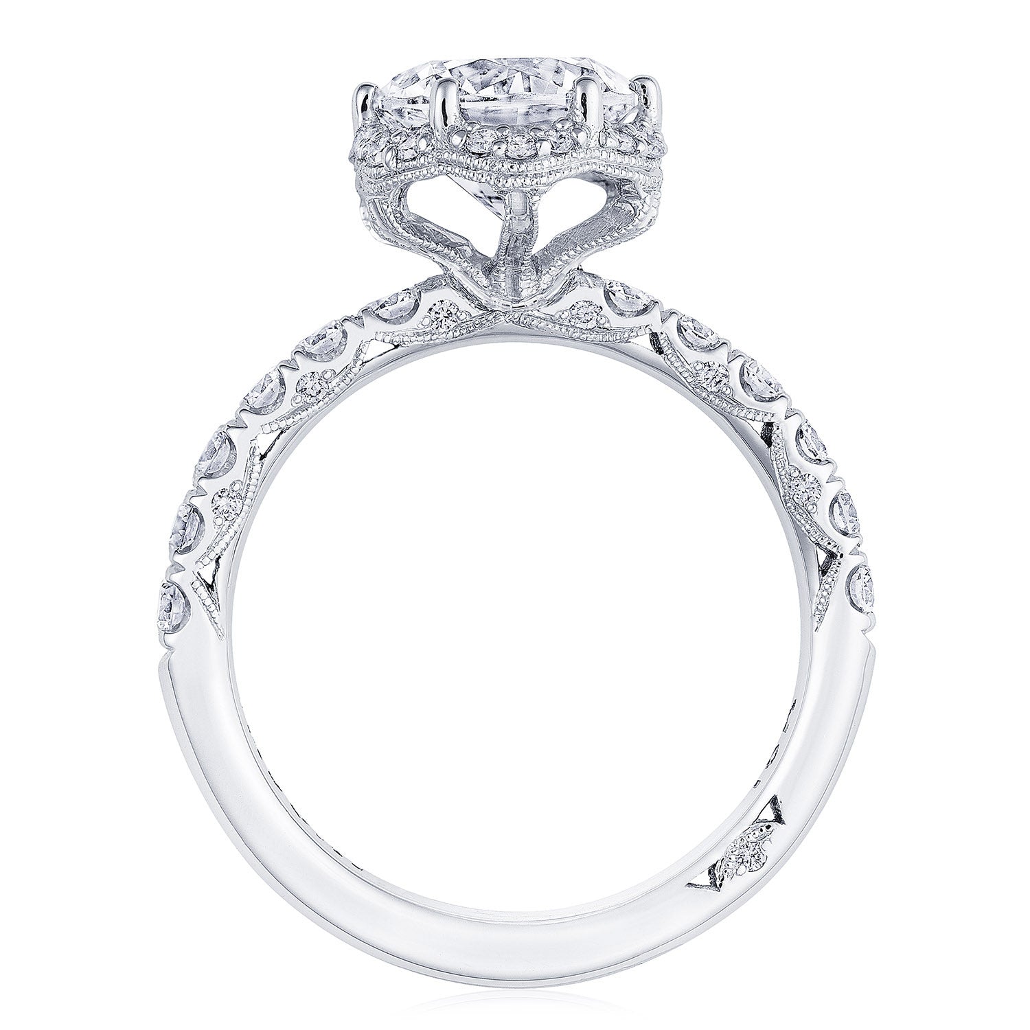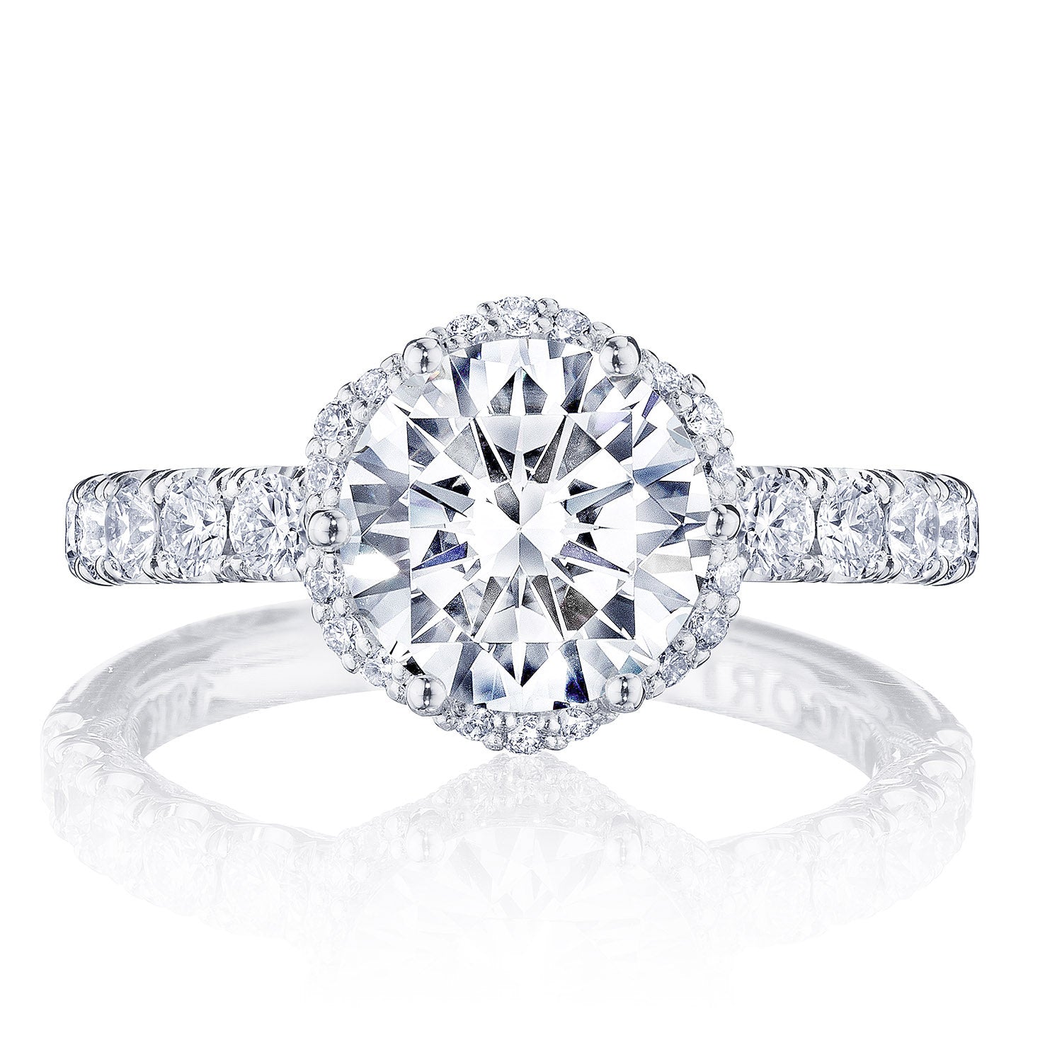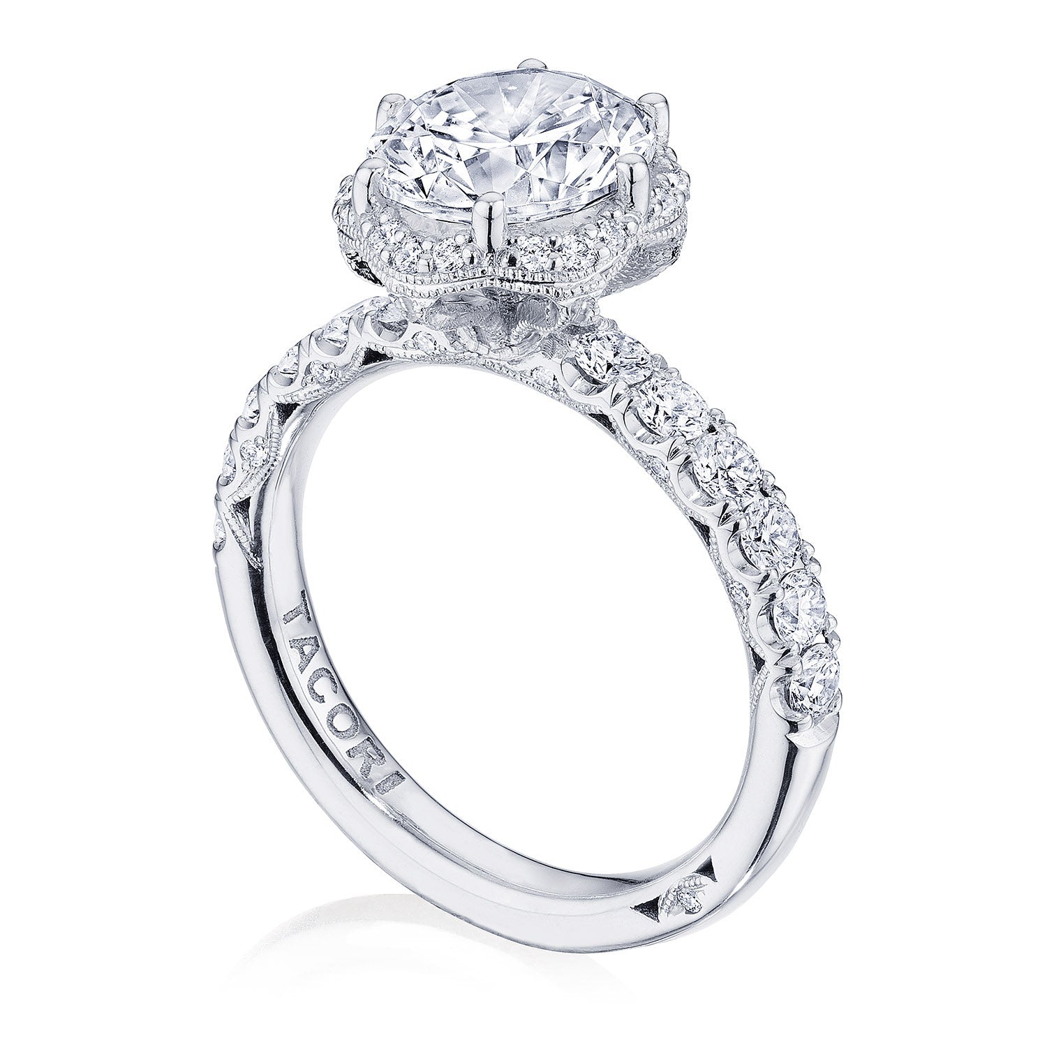 Pave-set diamonds lead towards a bloomed center stone, which floats on a Classic 360 foundation with an open gallery. The innerface of the band is decorated with Petite Crescent fabric, and a Signature Crescent marks the resting point.
