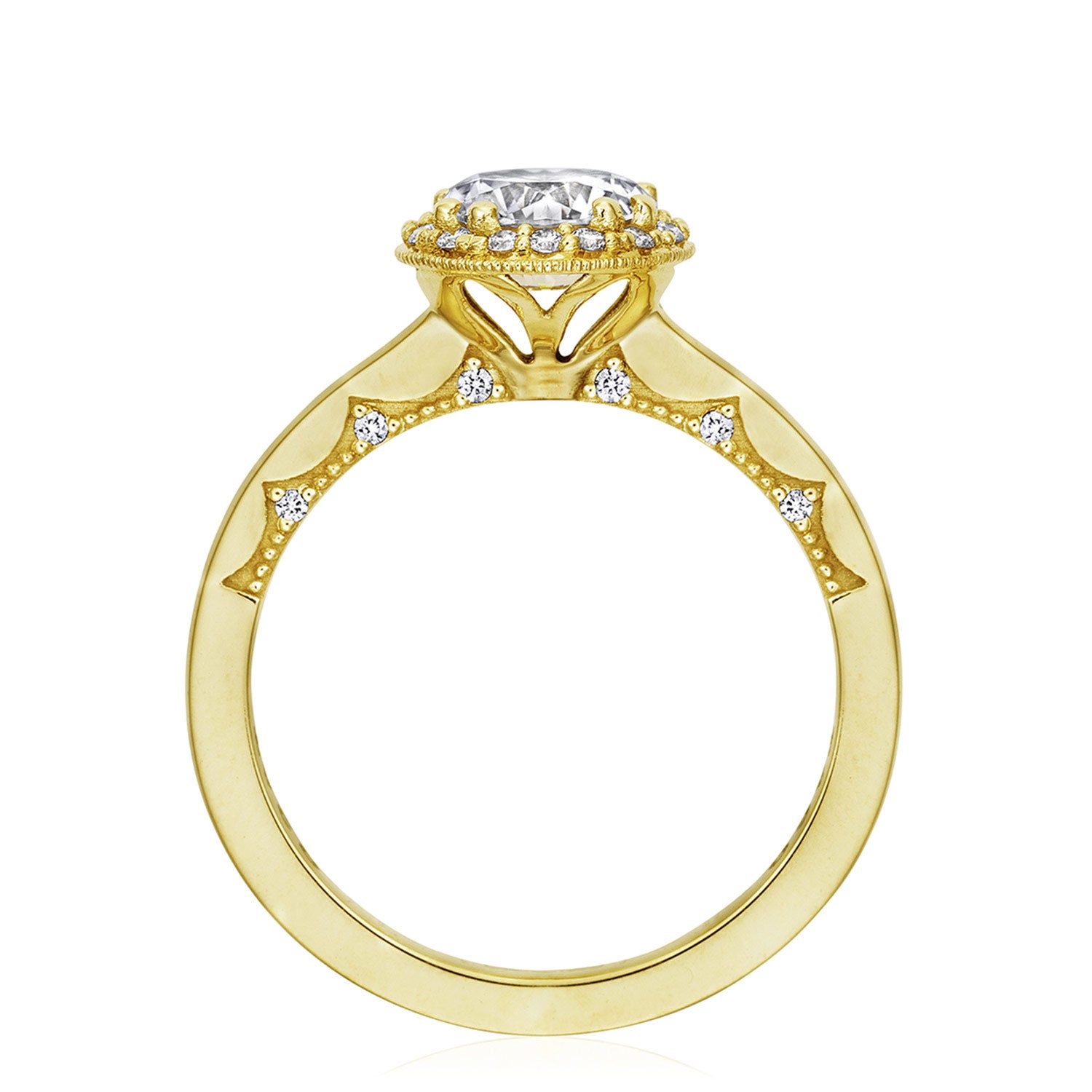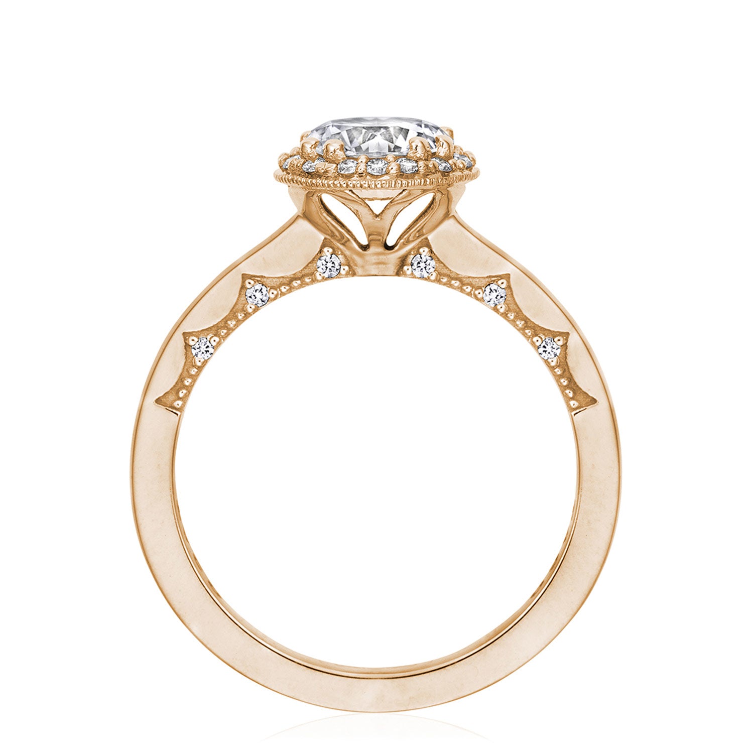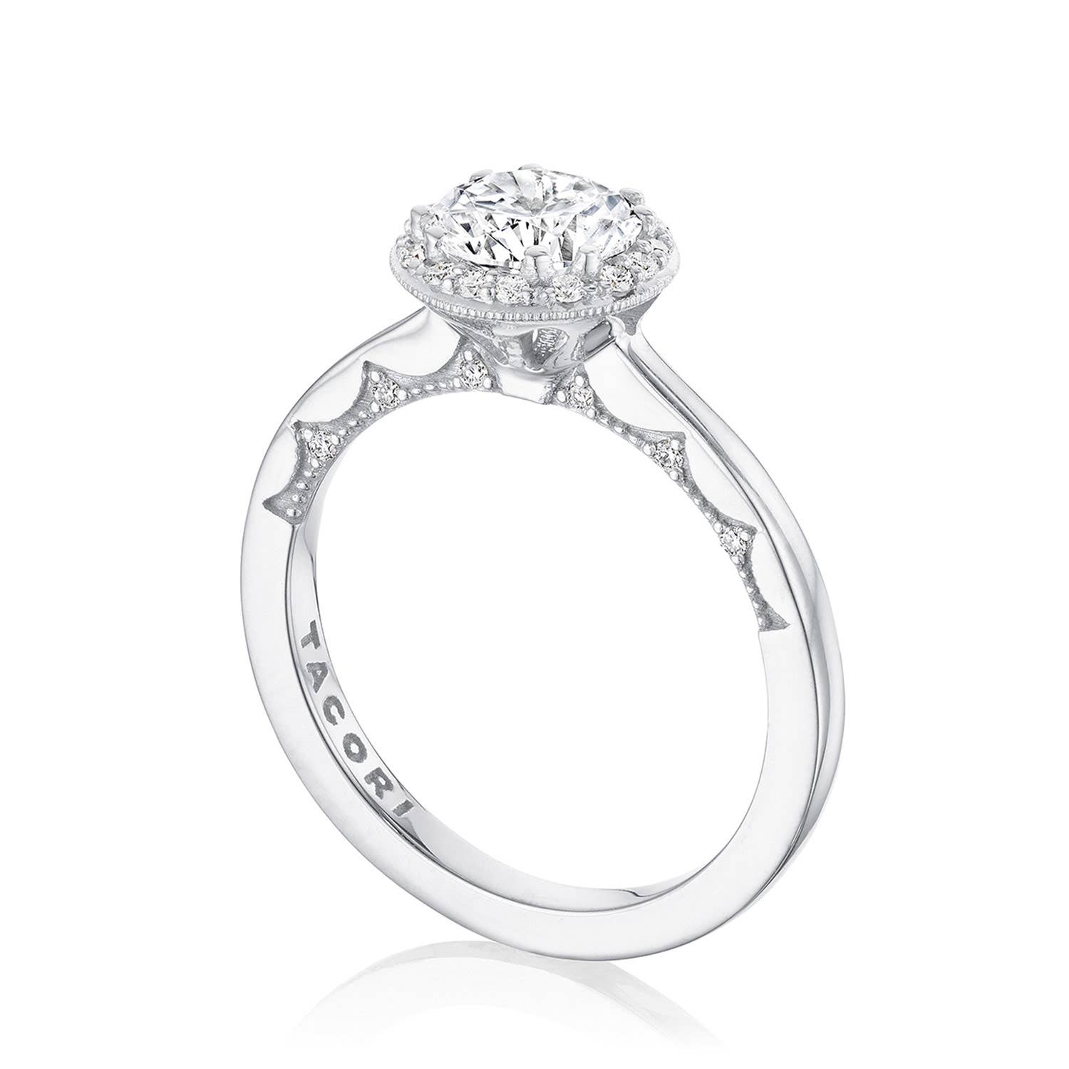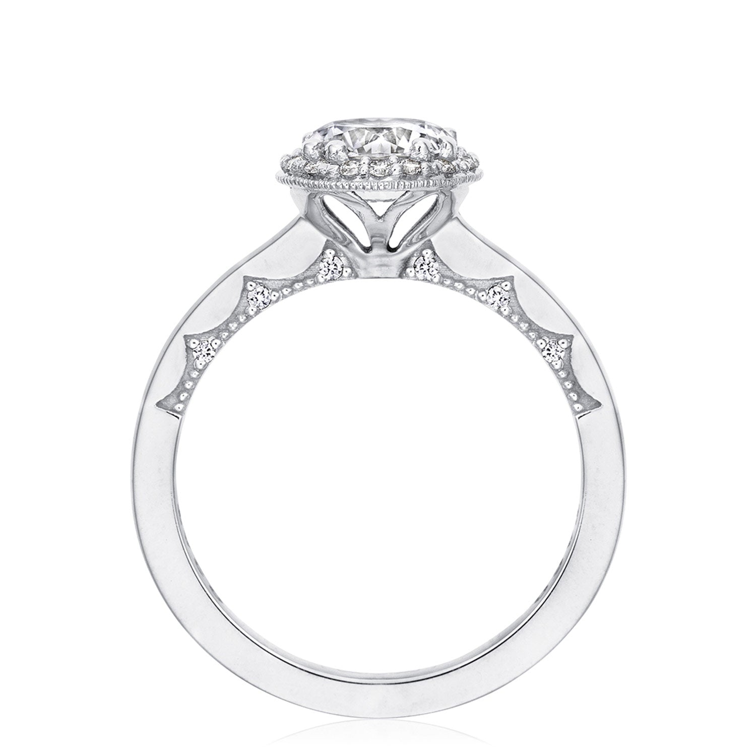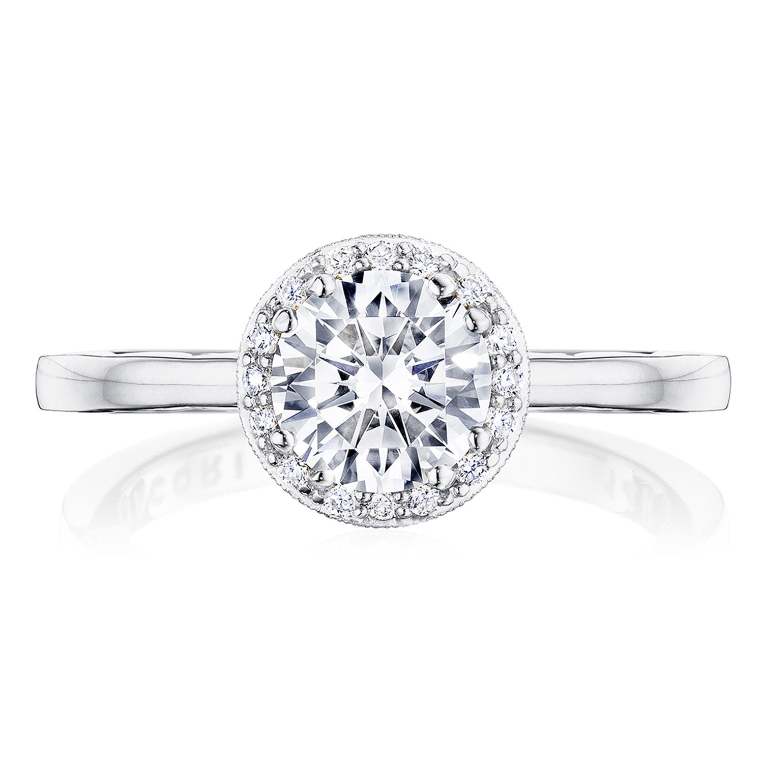Pinpoint diamonds decorate the clean lines of the Coastal Crescent fabric innerface, while round-brilliant diamonds frame the center stone. The band's clean lines are complemented with a metal-intense Cathedral foundation.