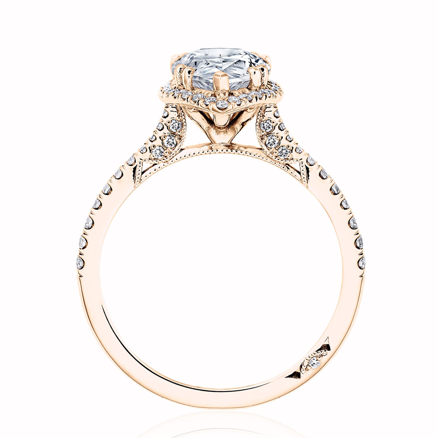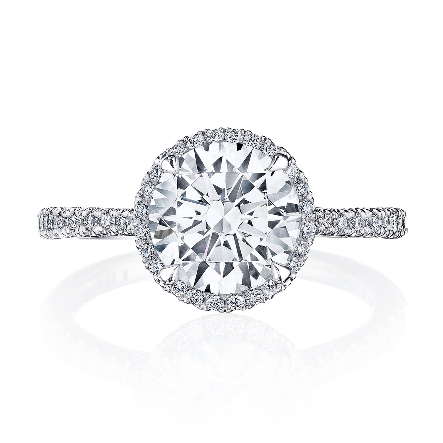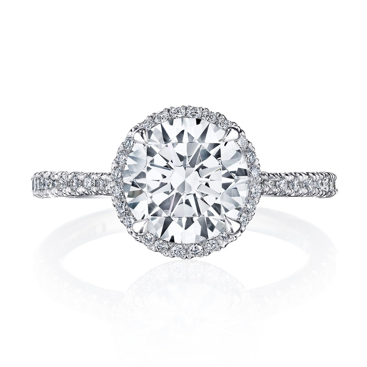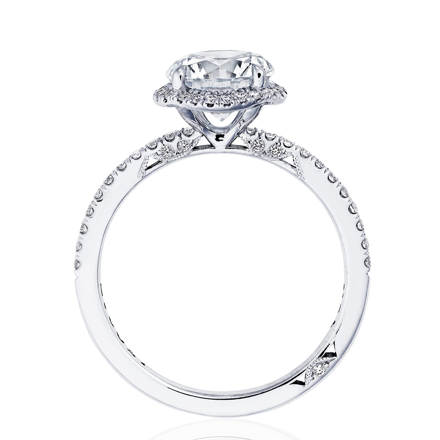 Contemporary and diamond-intense, with Simply TACORI Crescent Fabric and pavé-set diamonds adorning the ceiling. A stunning bloom encricling the round brilliant diamond delivers brilliant detail. A signature Crescent marks the ring as Truly TACORI.