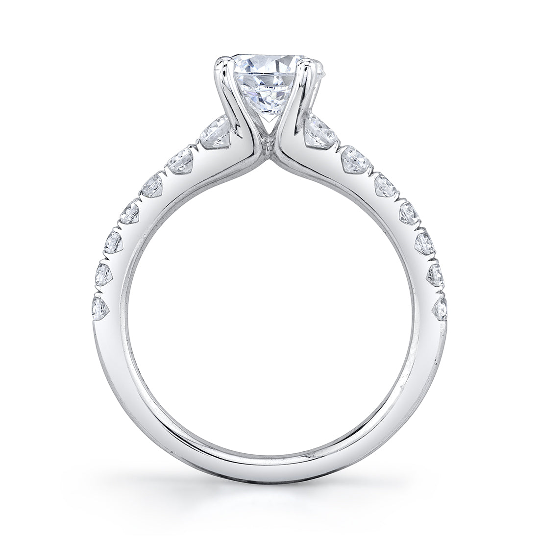 This stunning yet classic solitaire engagement ring features a 1 carat round center stone with shimmering diamonds cascading down each side of the shank for a total weight of 0.64 carats.