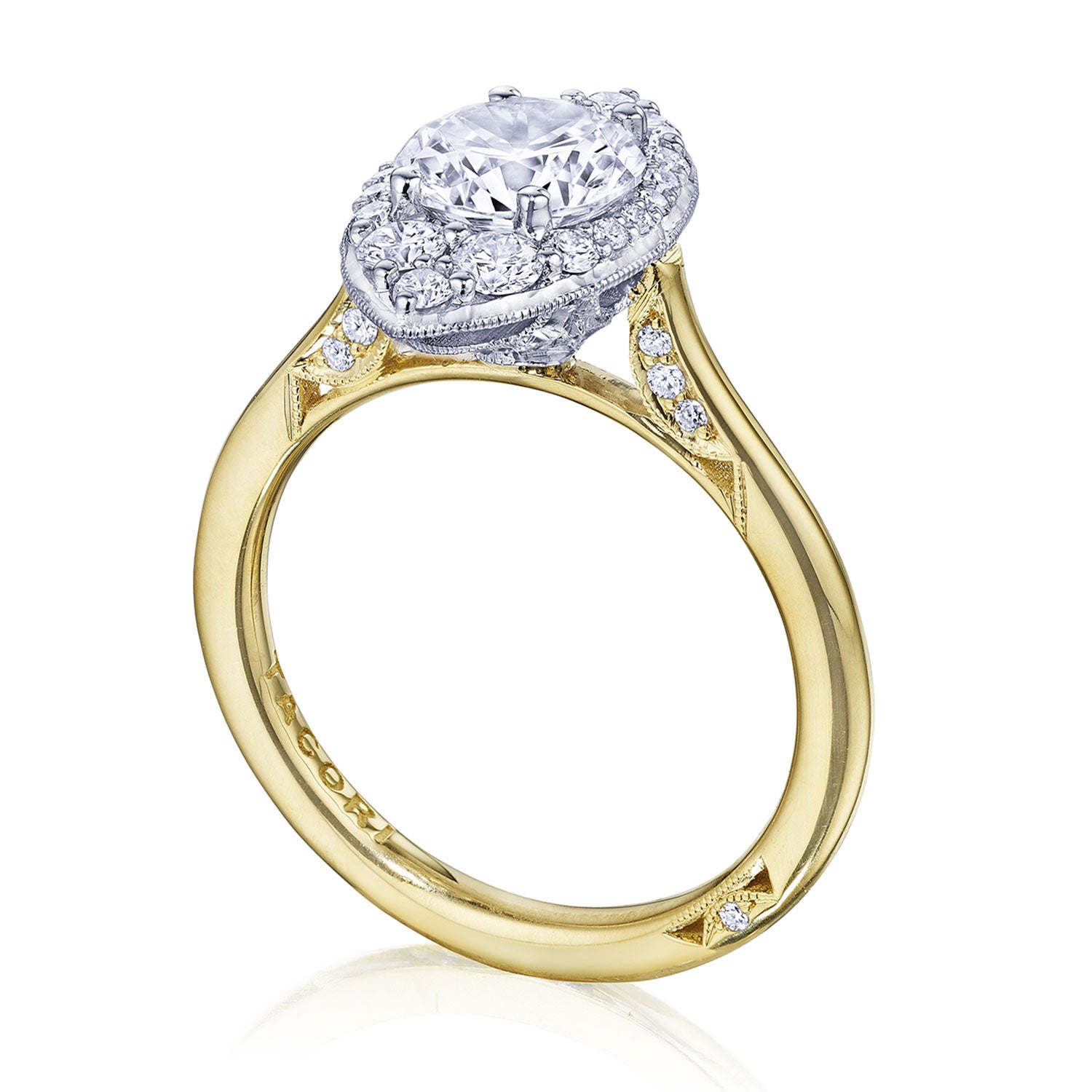 Round-brilliant diamonds around the center stone create a marquise-shape crown, which is set into an intricate Cathedral foundation. The high-polish band is lightly embellished with diamonds on the ceiling.
