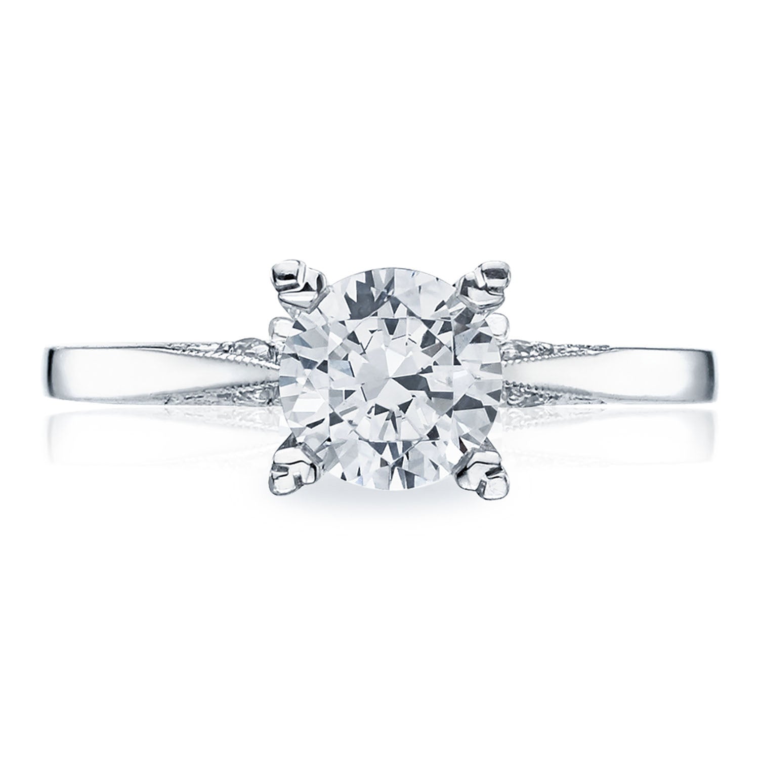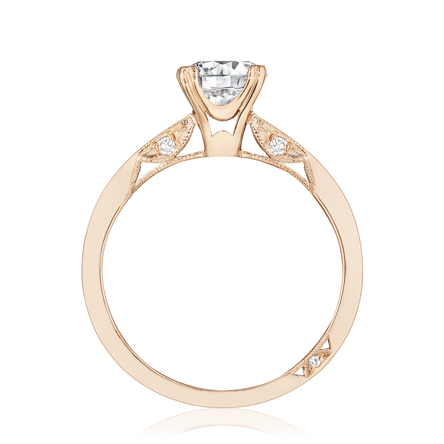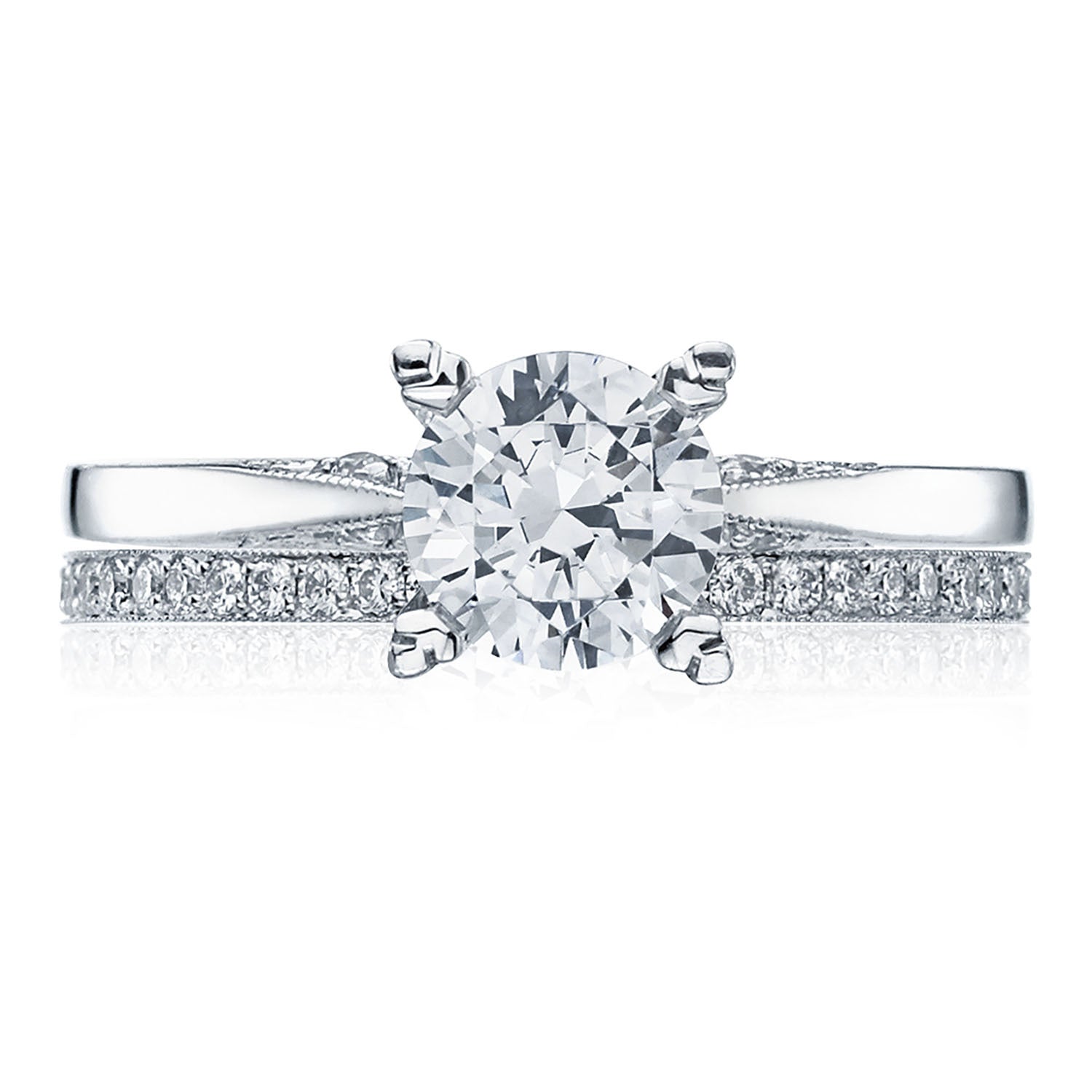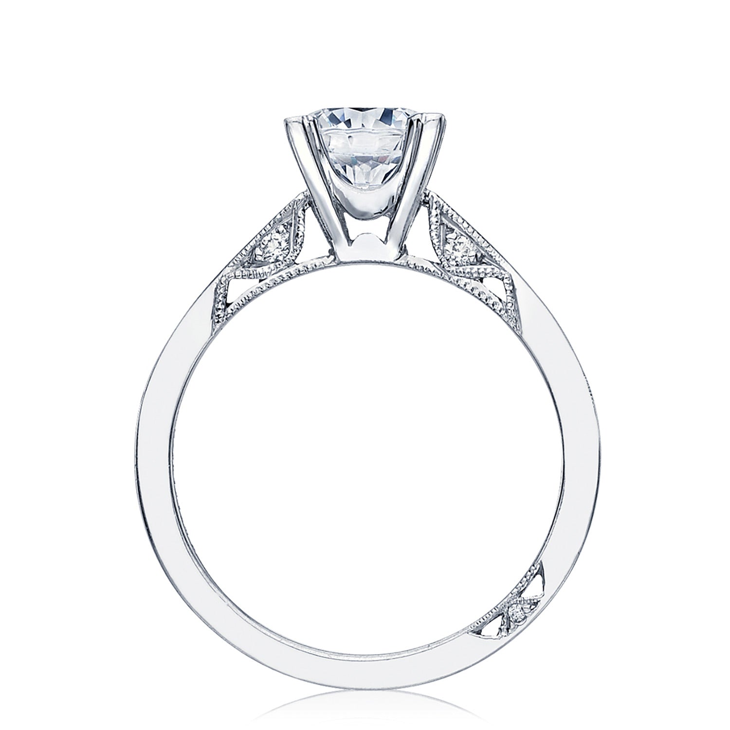 A tapered, high-polish band of Simply TACORI crescent fabric is decorated with hand-engraved milgrain and studs of round-brilliant diamonds. A metal-intense Cathedral foundation embraces the solitaire.