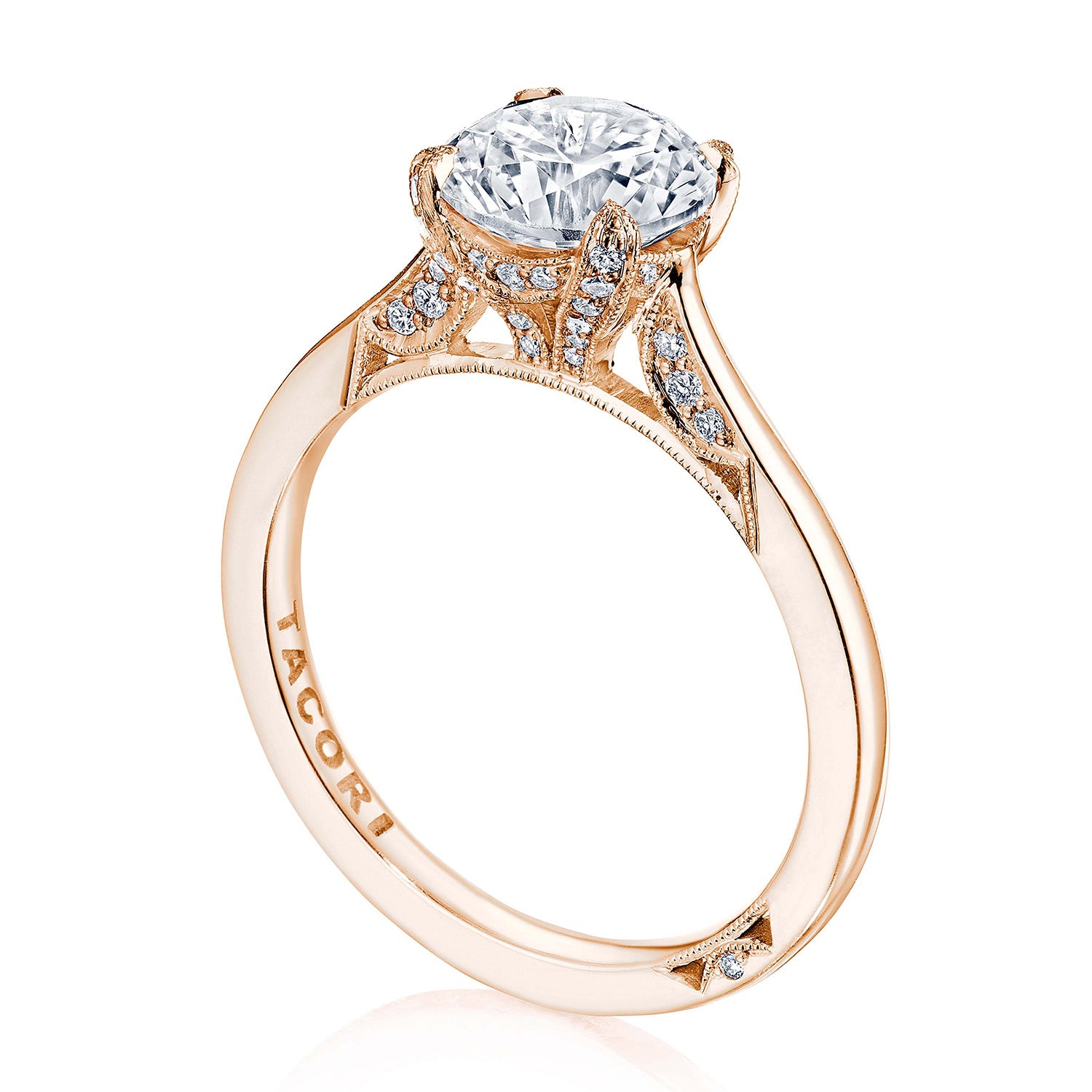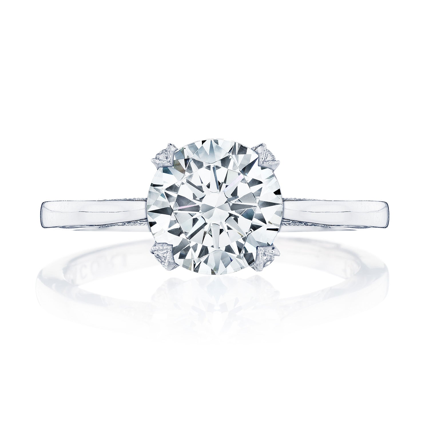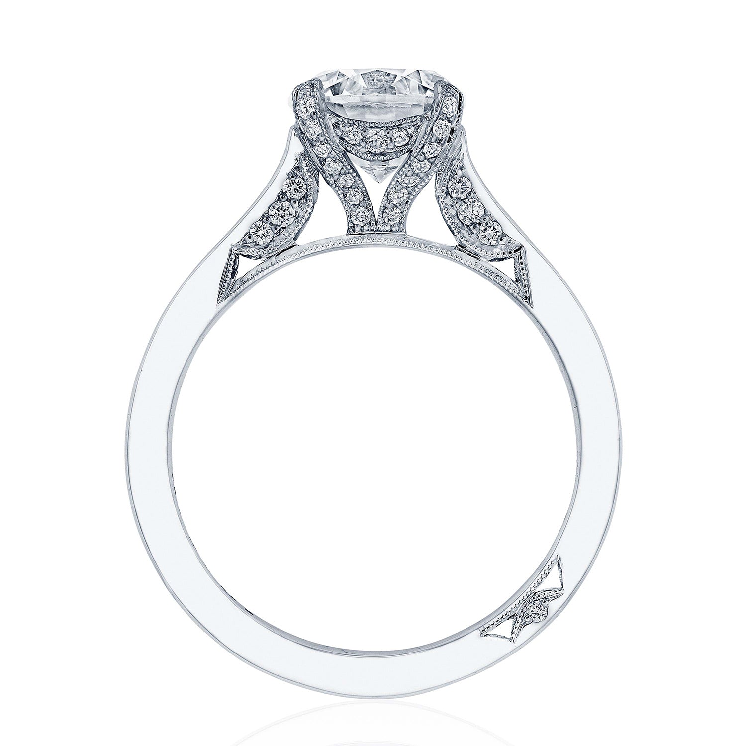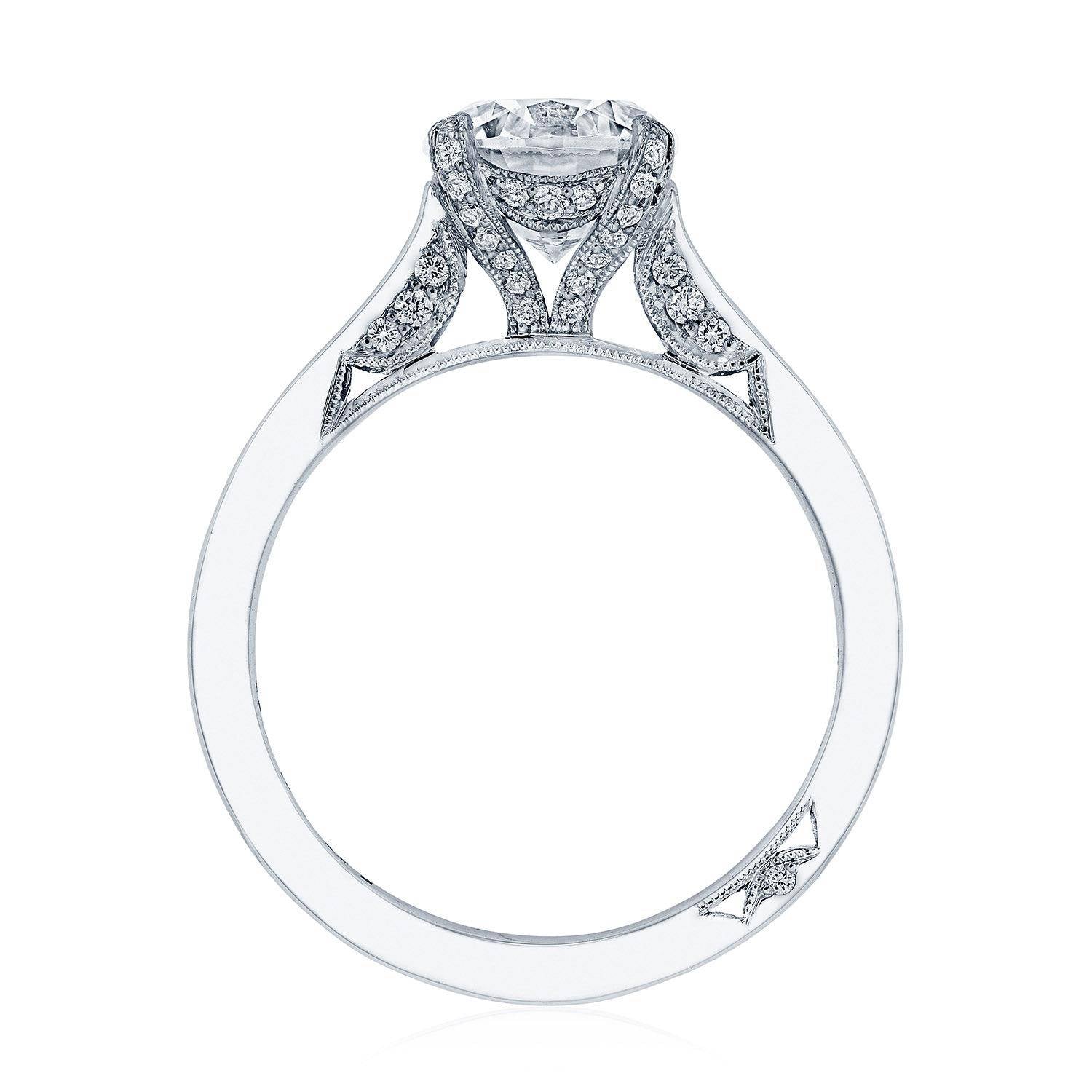 An effortlessly modern high-polish band is lightly embellished with diamond-studded Simply TACORI crescent fabric. The Cathedral Foundation boasts more round brilliant diamonds, and a hidden bloom makes the silhouette shine from all angles.