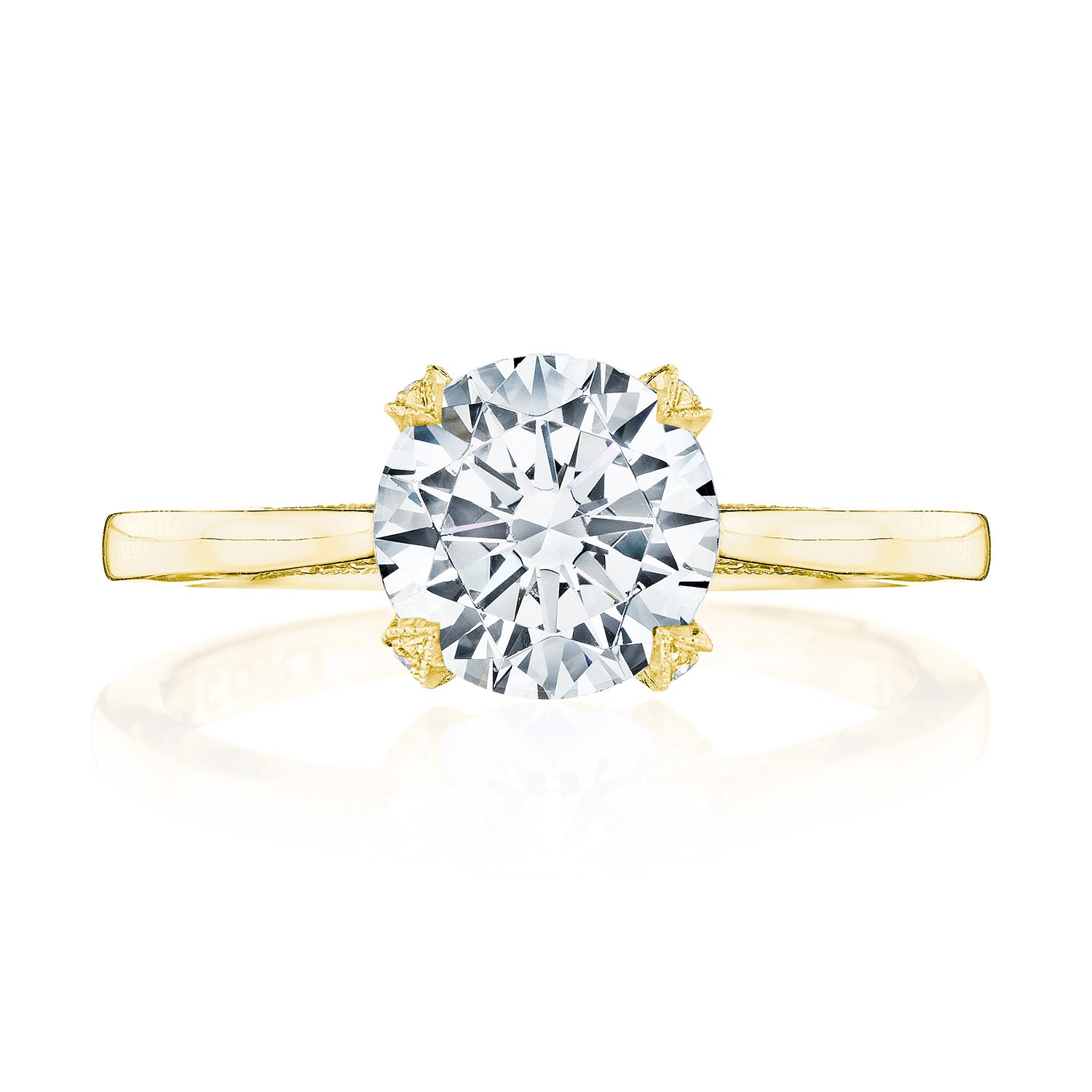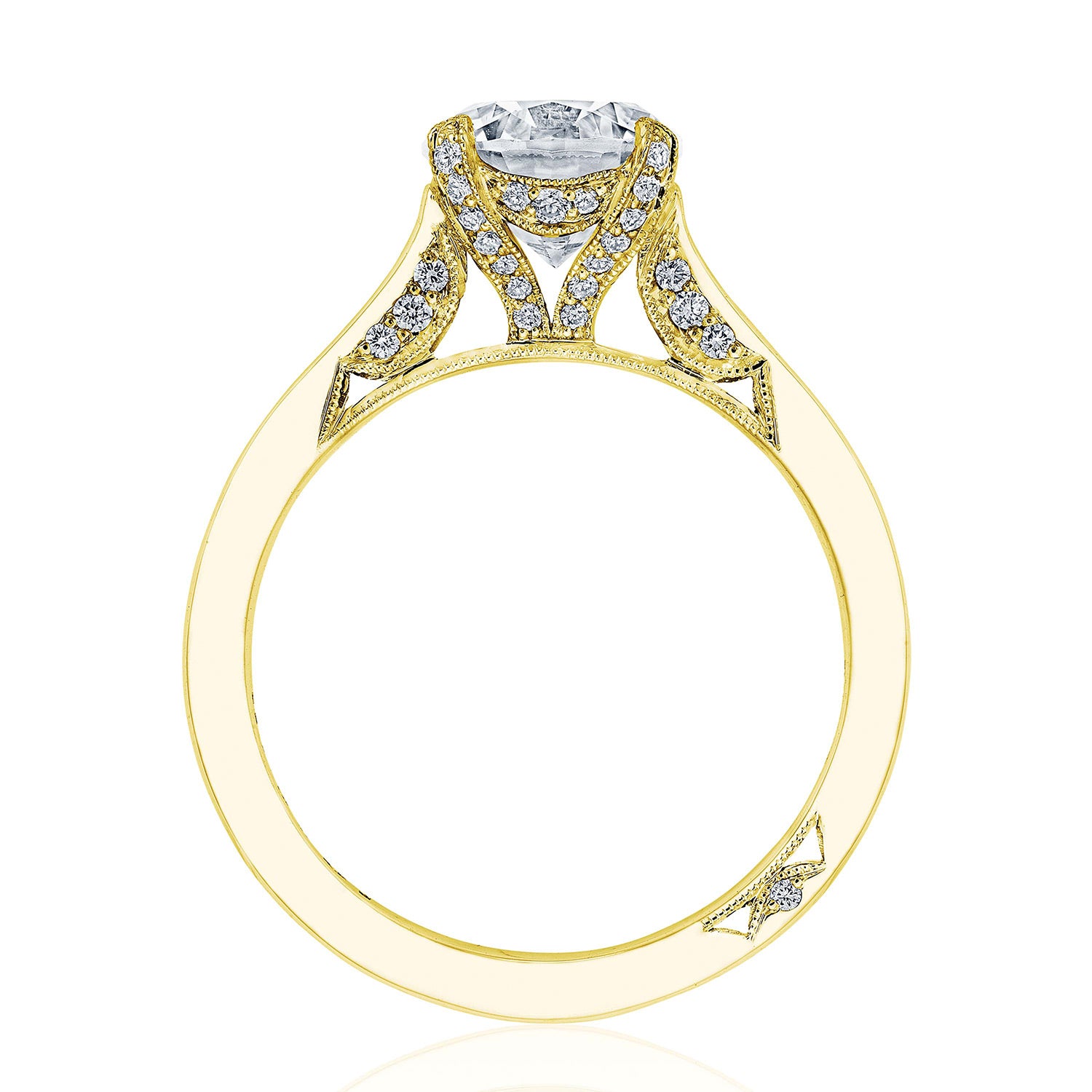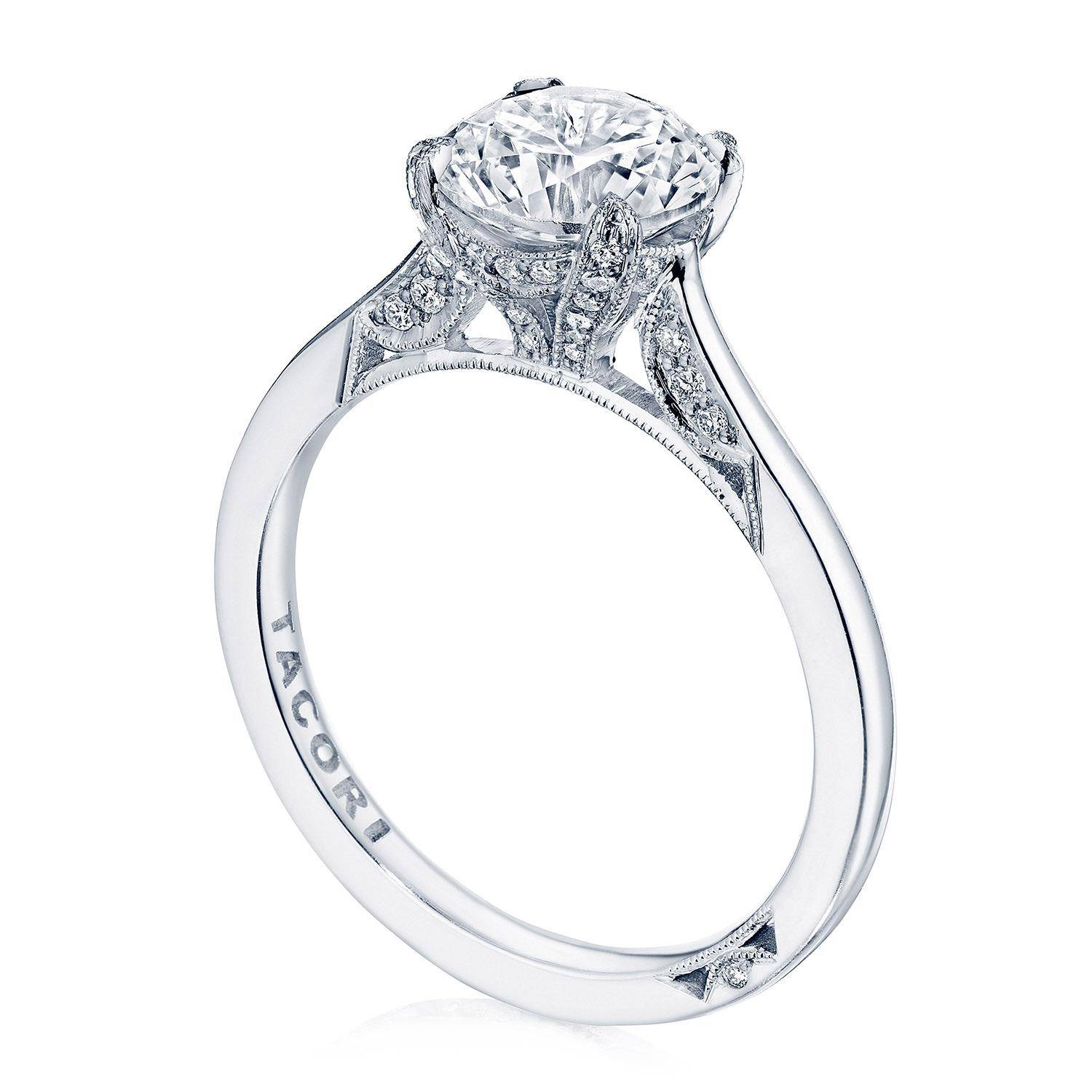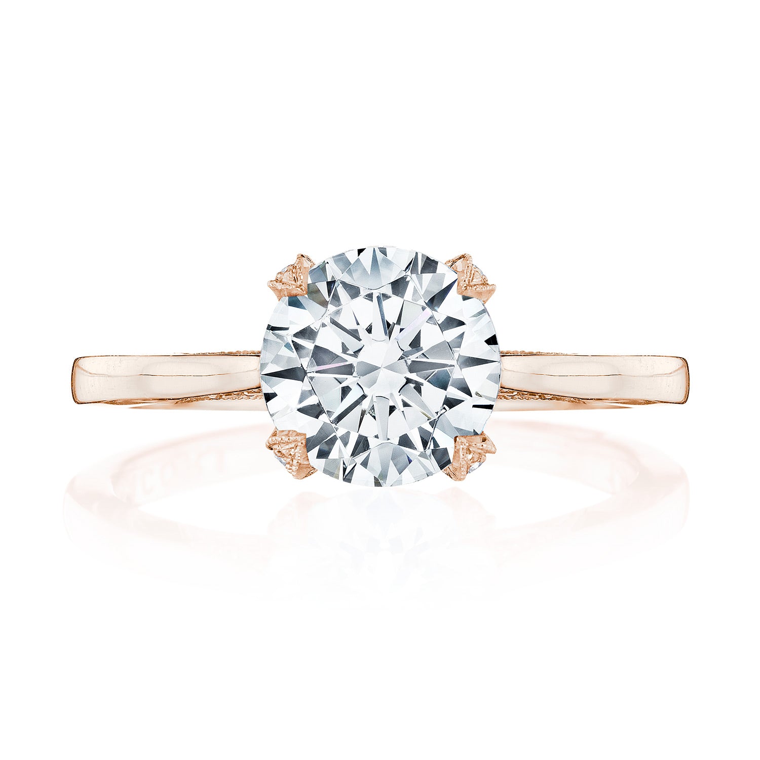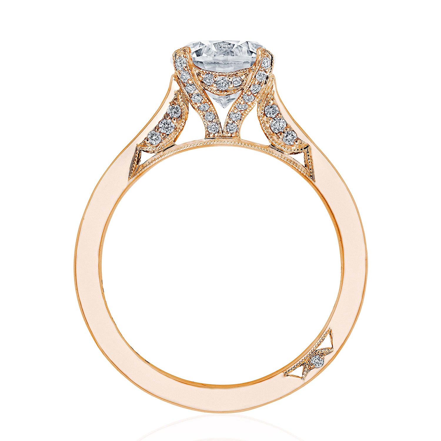 An effortlessly modern high-polish band is lightly embellished with diamond-studded Simply TACORI crescent fabric. The Cathedral Foundation boasts more round brilliant diamonds, and a hidden bloom makes the silhouette shine from all angles.