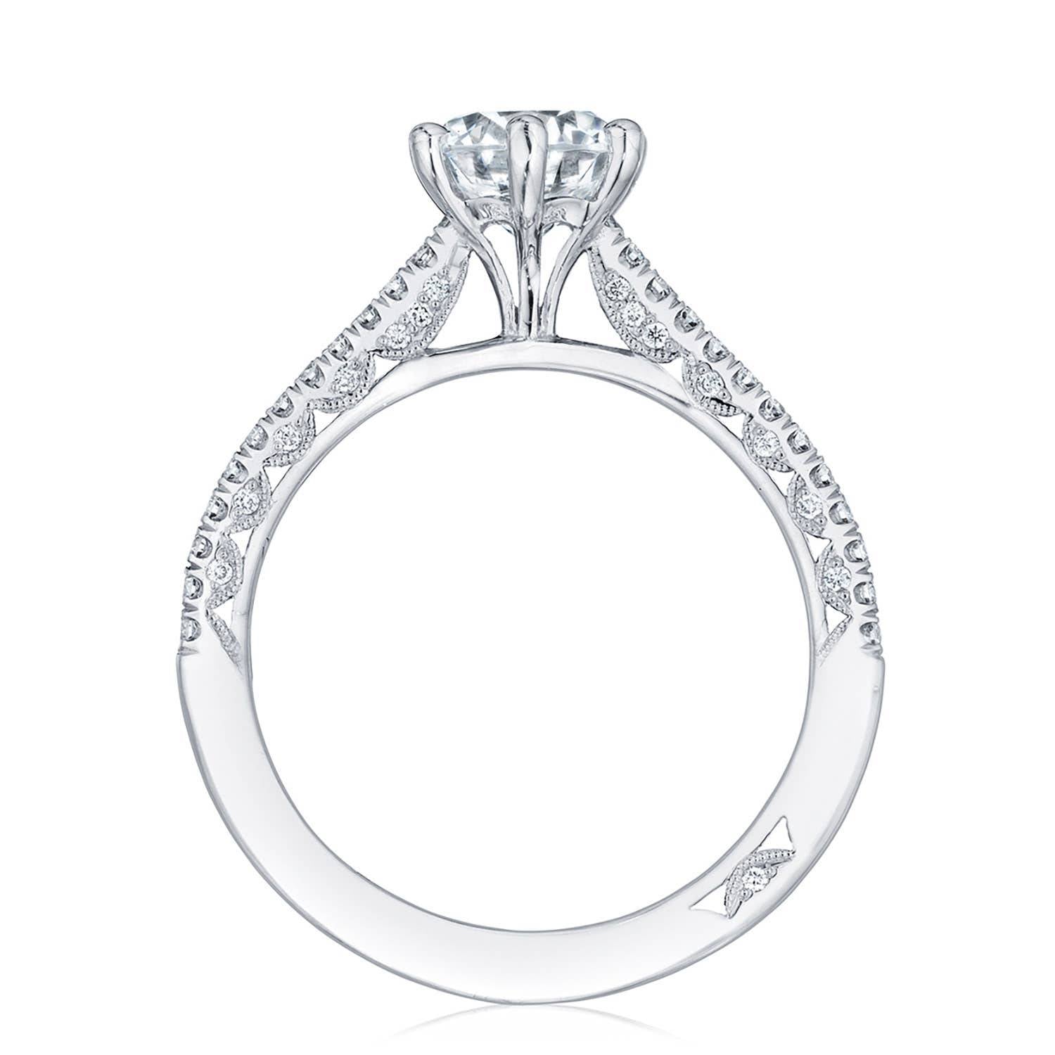 Set into a six-pronged Cathedral foundation, with round-brilliant diamonds decorating the ceiling and diamond-studded Petite Crescent fabric adding brilliance to the profile. A Signature Crescent marks the resting point of the ring.