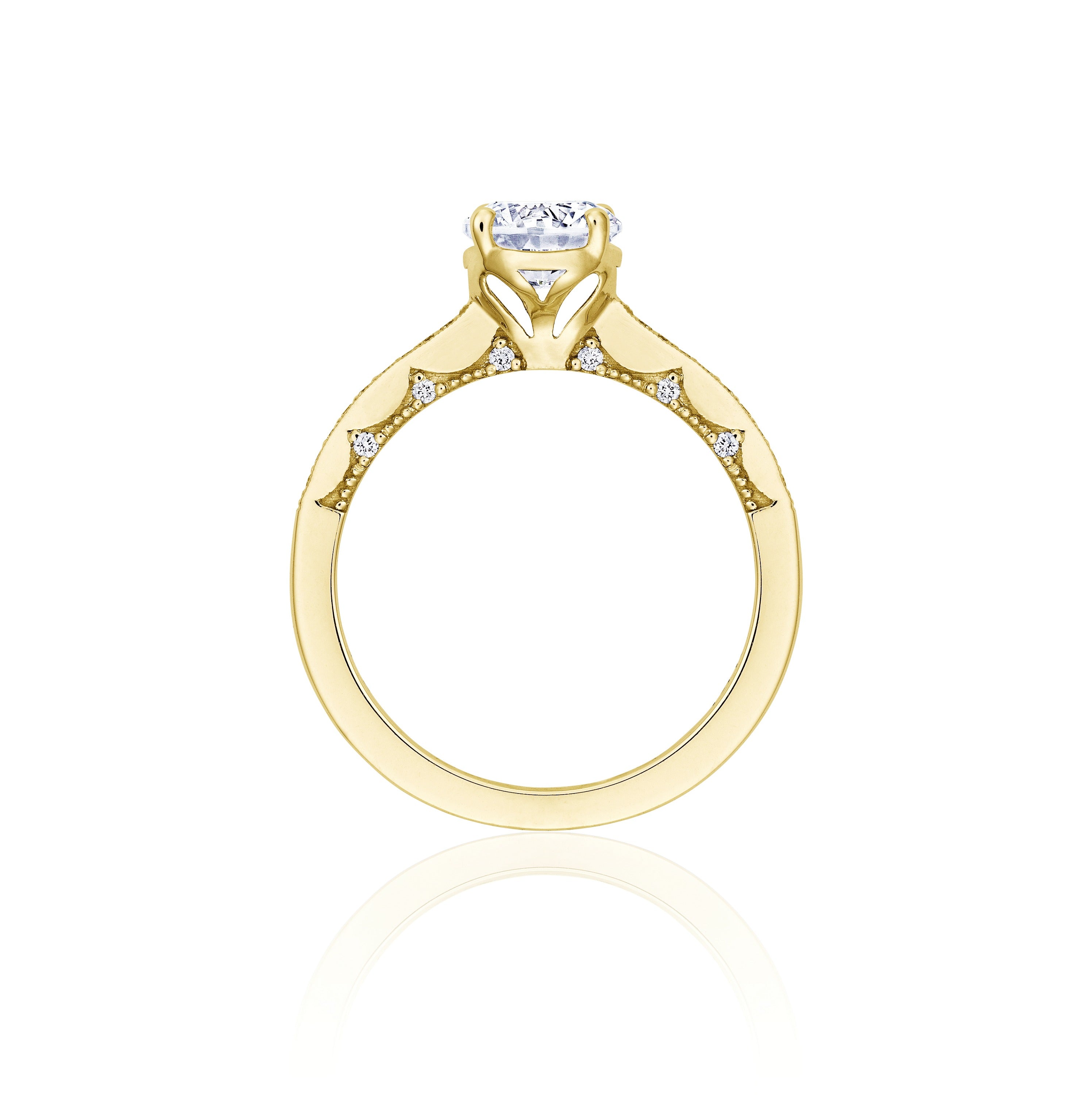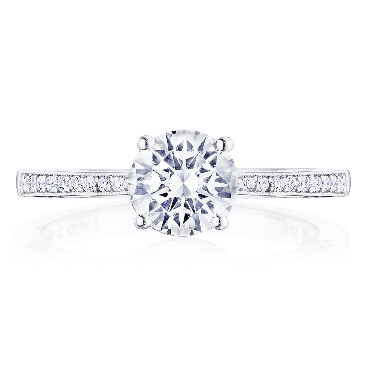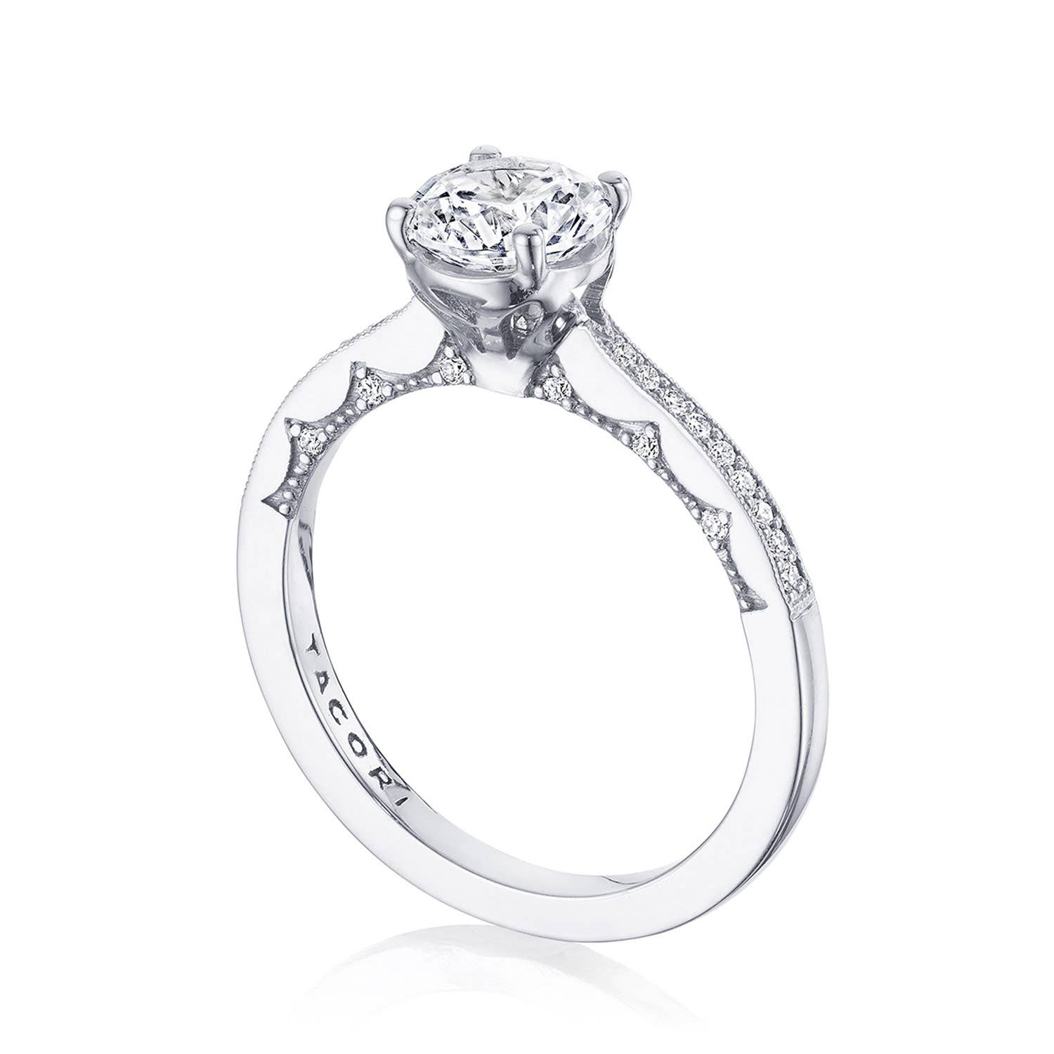 Dainty round-brilliant diamonds decorate the ceiling and lead to the center stone, which embraced by a Cathedral foundation. Coastal Crescent fabric with pinpoint diamond detailing adds a clean texture to the innerface.