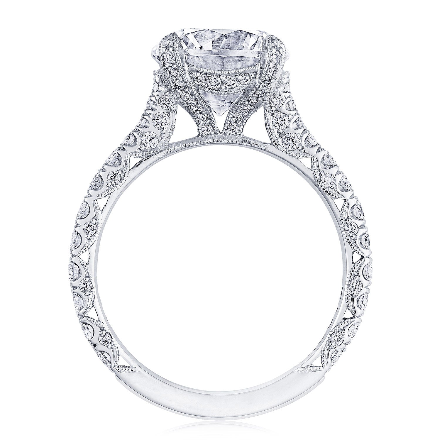Diamond-studded Petite Crescent fabric decorates the innerface, while pavé-set diamonds lead up the ceiling towards the solitaire, which is set into the diamond-studded prongs. A hidden bloom adds brilliance beneath the crown.