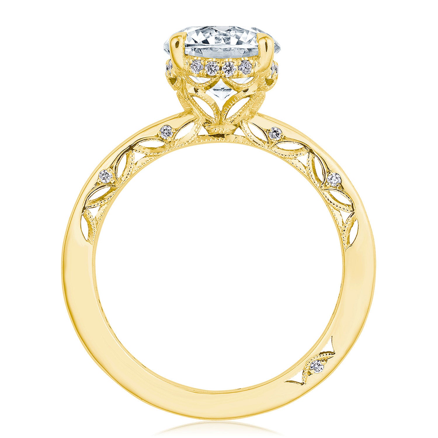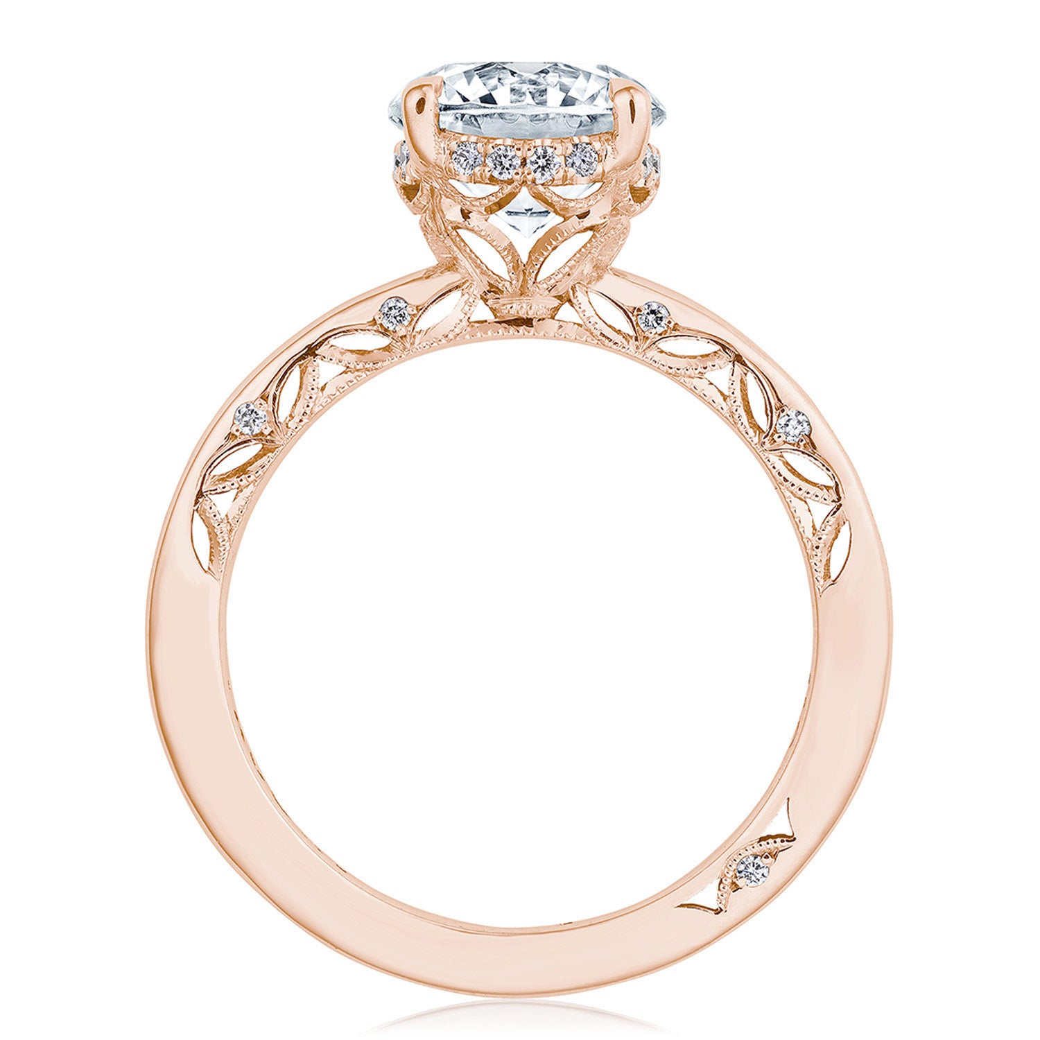 A high-polish ceiling accented with lace-like tracery makes for a stunningly airy setting. The hand-hewn milgrain and pinpoint diamonds add nuance, while a hidden bloom creates dimensional light. A Signature Crescent marks the resting point.