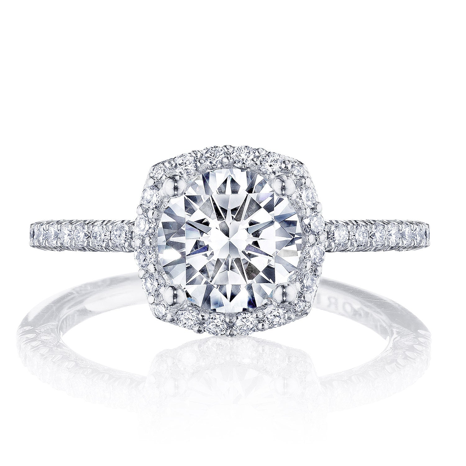 Pave-set diamonds decorate the ceiling, while a cushion bloom adds dimension to the center stone. The crown floats on a Classic 360 foundation above a band of Petite Crescent with more diamond detailing. A Signature Crescent marks the resting point.