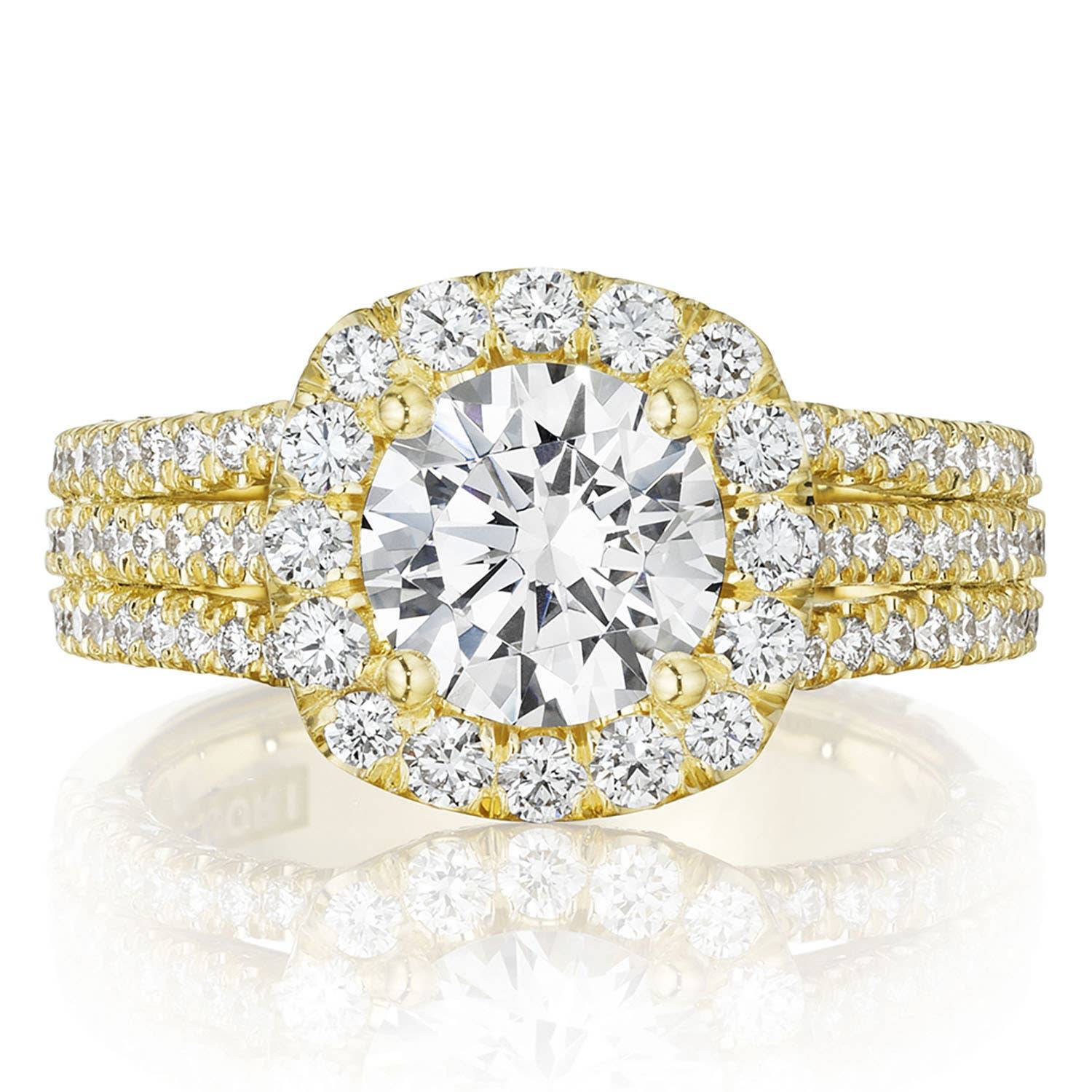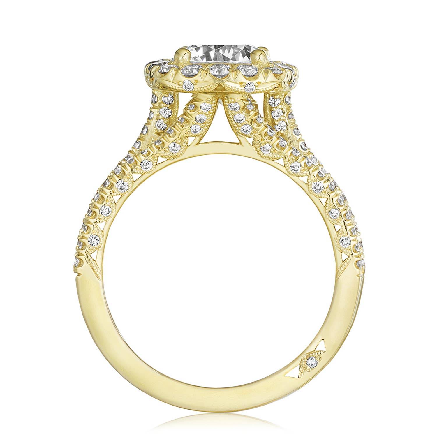 A band of diamond-studded Petite Crecent fabric breaks into three diamond-studded branches, which culminate in a cushion bloom around the center stone. A Signature Crescent marks the resting point of the ring.